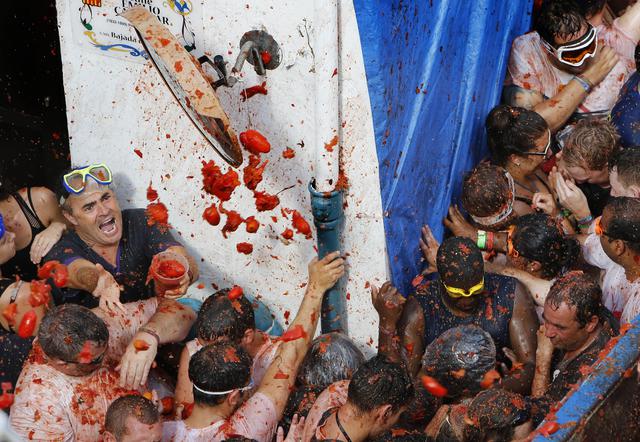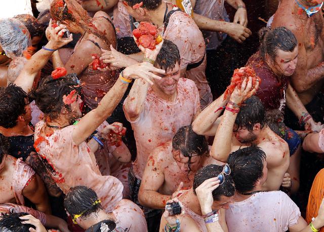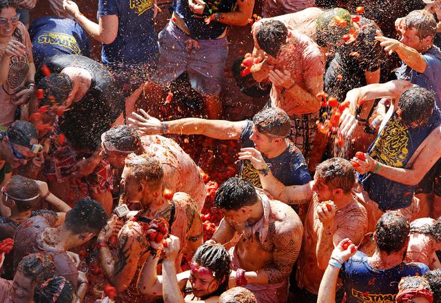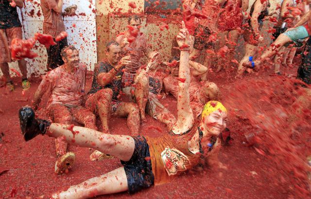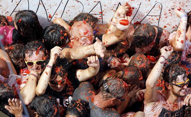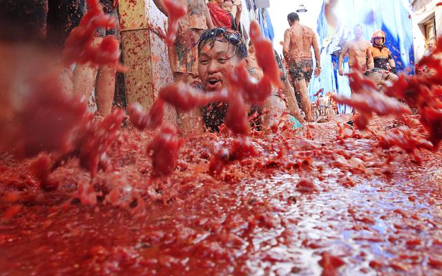 VALENCIA (SPAGNA) – Nel villaggio di Bunol che si trova a circa 50 chilometri da Valencia, è partito il “Tomatina Festival”, l’annuale battaglia dei pomodori. Le strade della cittadina spagnola si trasformano in un mare di polpa rossa su cui la gente si diverte a lanciarsi. La festa richiama migliaia di turisti e curiosi da ogni parte del mondo e quest’anno festeggia il suo 70esimo anniversario.