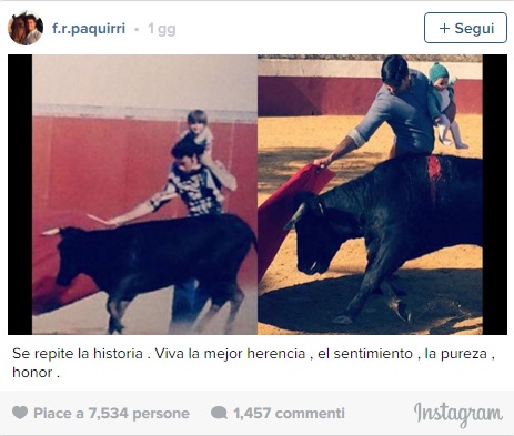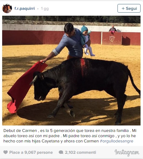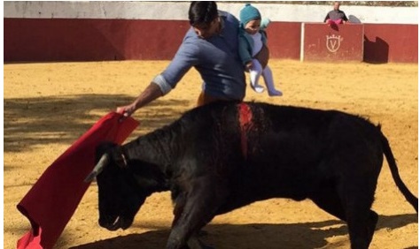 MADRID – Torero in arena con figlia 5 mesi: polemiche sui social. Accade in Spagna e la foto fa il giro del web. A farsi fotografare con la figlia è Francisco Rivera: il matador “torea” contro un piccolo toro coperto di sangue con la figlioletta Carmen di cinque mesi in braccio. “E’ una tradizione di famiglia” ha spiegato il torero. “Mio nonno ha toreato con mio padre, mio padre con me, io l’ho fatto con mia figlia” ha spiegato su twitter.