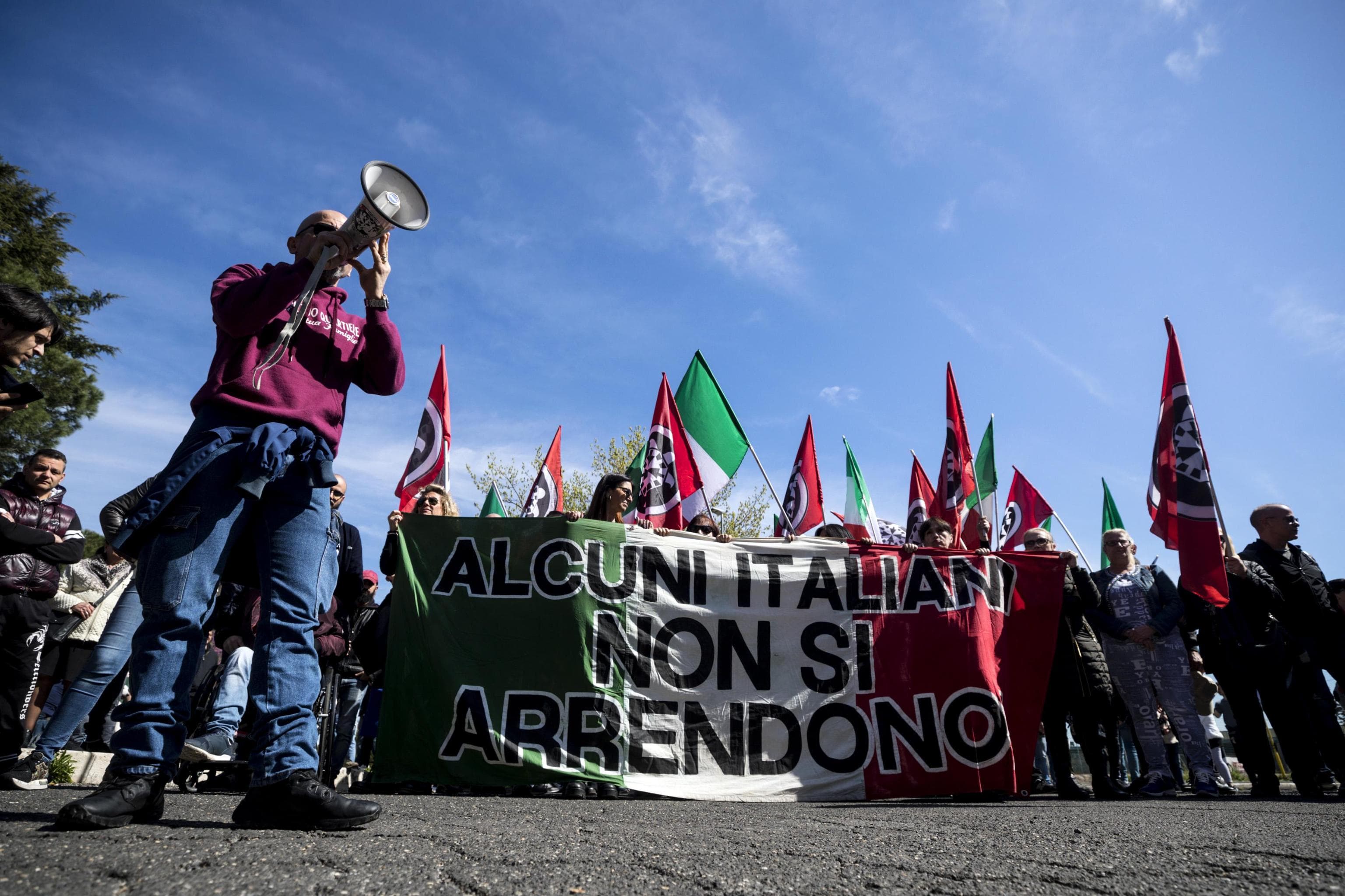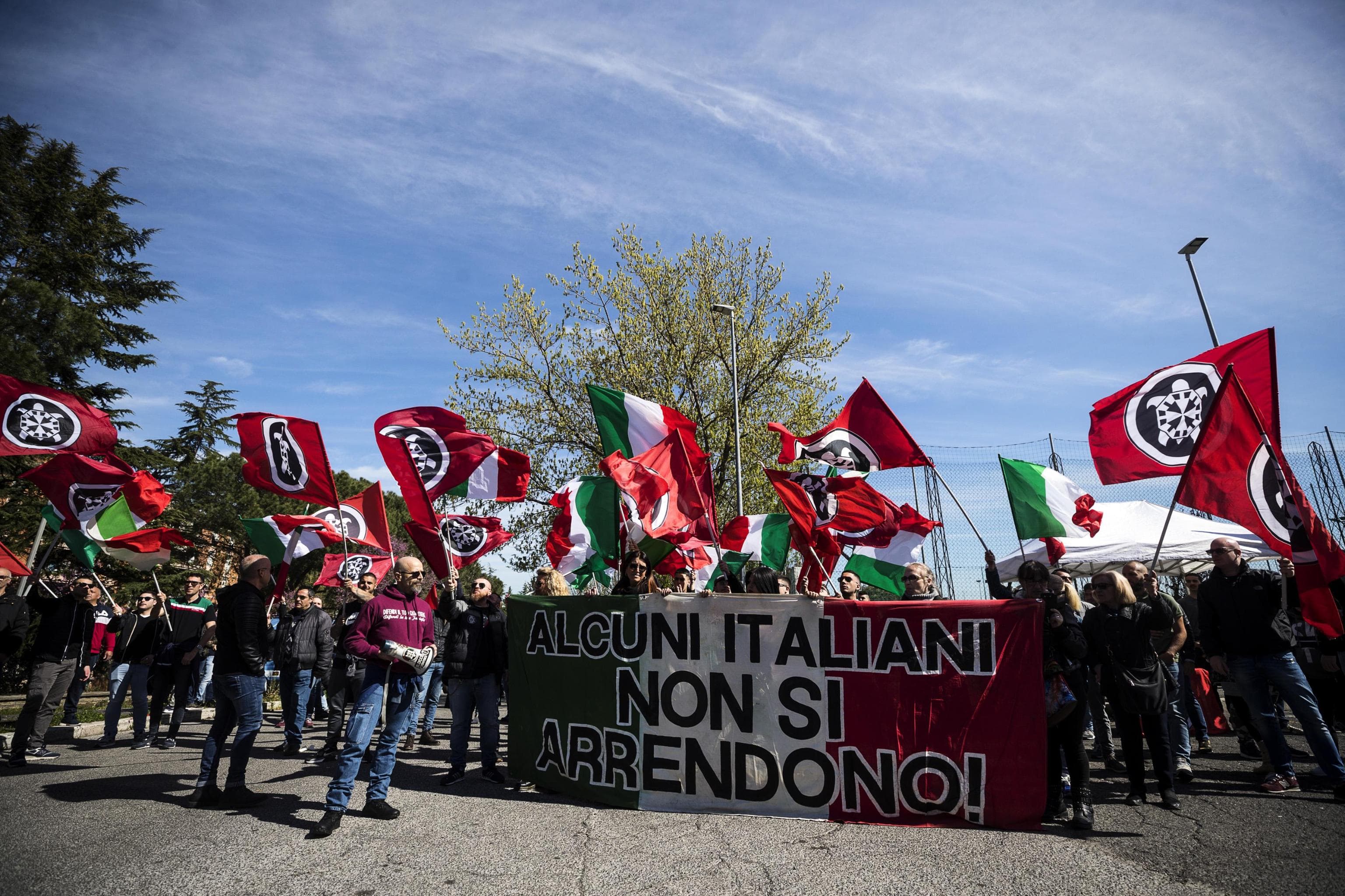 Bandiere tricolore, un grosso striscione con su scritto “Alcuni italiani non si arrendono” e qualche ‘scatto’ davanti al centro di accoglienza svuotato dopo le accese proteste anti-nomadi dei giorni scorsi. E’ iniziata la manifestazione di Casapound a Torre Maura a poche centinaia di metri dalla struttura che avrebbe dovuto ospitare diverse famiglie di nomadi. “Difendi il tuo quartiere. Difendi la tua famiglia” c’è scritto sulla felpa di uno dei rappresentanti di Casapound. A scendere in piazza anche diversi abitanti che nei giorni scorsi erano scesi in strada per protestare contro l’arrivo dei nomadi.