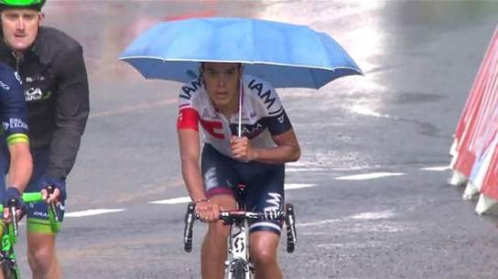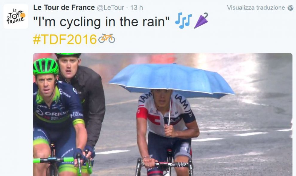 ROMA – I ciclisti impeganti sui Pirenei per la nona tappa del Tour de France, in prossimità dell’arrivo sono stati colpiti da una violentissima grandinata. Il colombiano Jarlinson Pantano è rimasto più indietro rispetto al gruppo di testa. Pantano non ha resistito e si è fatto passare un ombrello, sotto al quale ha tagliato il traguardo. Poi su Twitter dove sono state postate le foto con l’ombrello in mano (ma il regolamento lo consente? n.d.r)ha commentato scherzosamente.