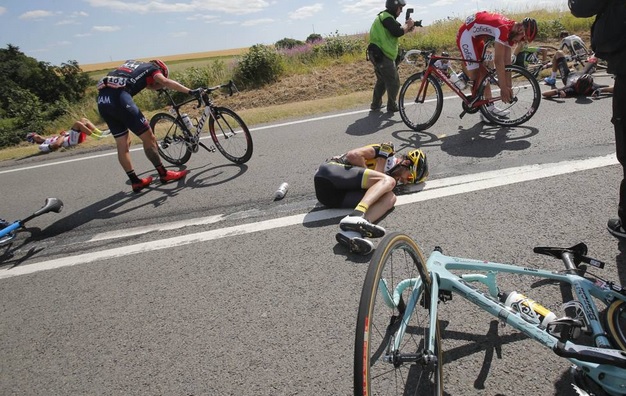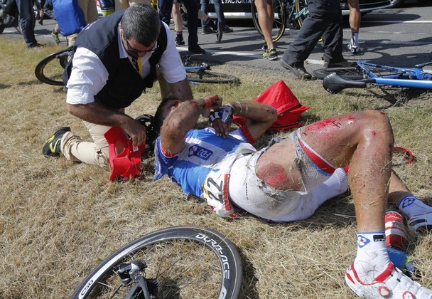 Altri atleti sono stati coinvolti in cadute nella prima parte della tappa, l’olandese Bauke Mollema e Nicholas Roche e il francese Coquard, ma sono riusciti a risalire in sella e a riprendere la corsa. Il 102/o Tour de France di ciclismo prosegue oggi con la disputa della 5/a tappa, che porterà la corsa a tappe transalpina da Arras Communautè Urbaine ad Amiens Mètropole, per un totale di 189,5 chilometri. Sarà una frazione con un percorso nervoso, ma senza particolari difficoltà altimetriche. Il tedesco Tony Martin, da ieri leader della corsa, partirà in maglia gialla, davanti al britannico Chris Froome, staccato di soli 12″. Le foto Ap della caduta.