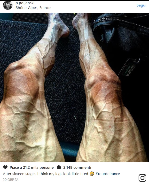 ROMA – Pawel Poljanski posta su Instagram una foto con le vene in rilievo e i muscoli gonfi. Il corridore è affaticato per via del Tour de France e si vede: i suoi arti inferiori sono ridotti davvero male.