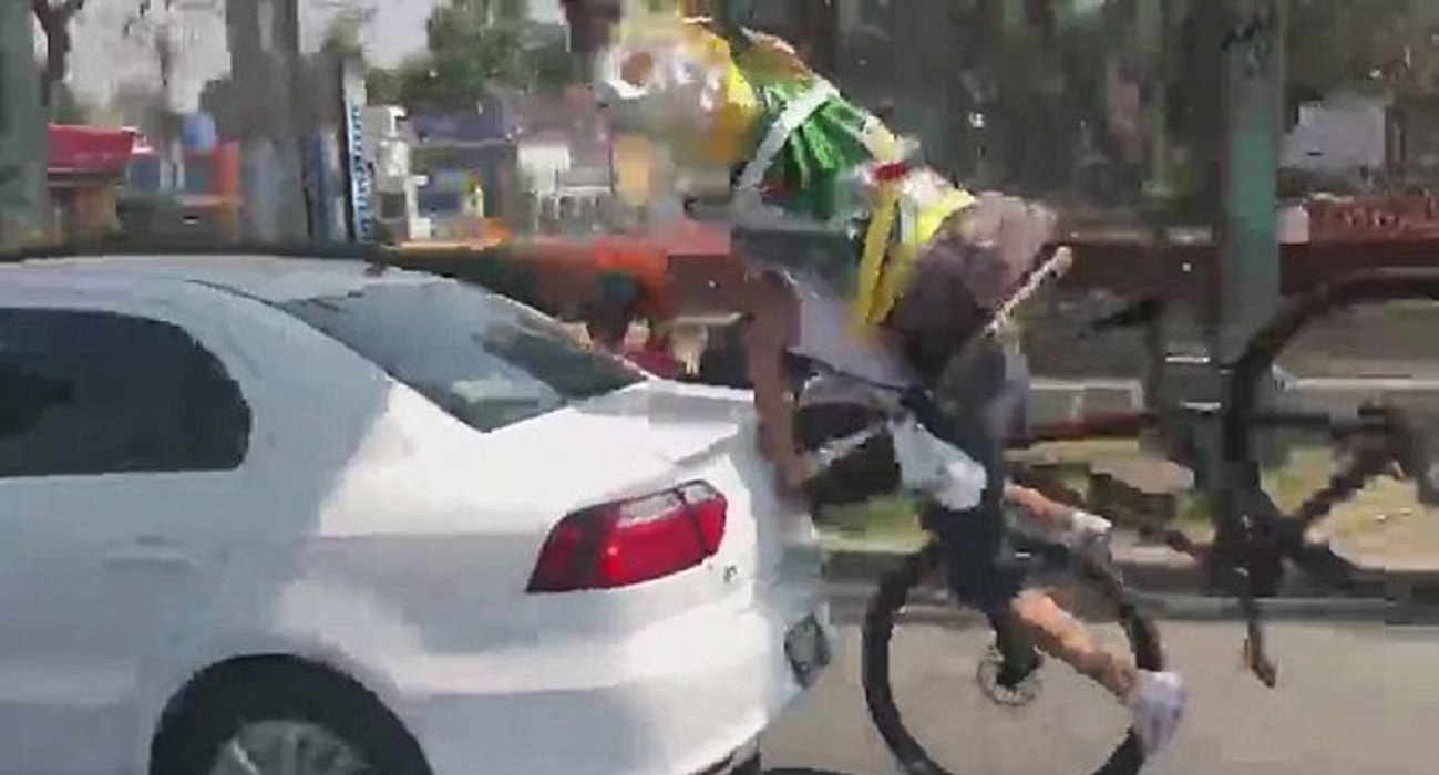 Nel video, registrato da un passeggero a bordo di un minivan, si vede un incidente provocato a quanto pare per distrazione del ciclista che si gira a guardare forse la persona che lo riprende, non accorgendosi allo stesso tempo che l’auto che viaggia davanti si è fermata.
