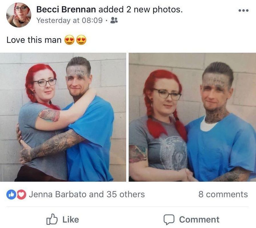 LONDRA – Becci Brennan è una mamma britannica di 4 figli. La donna, 29 anni, ha deciso di prendere un aereo per andare a sposare in carcere il 32enne Travis Thompson, un ex membro di una banda criminale che dovrebbe uscire dal carcere nel 2023 e che in fronte ha tatuata la parola “hate”, ossia “odio”. La donna racconta di essersi innamorata di Travis dopo averlo contattato tramite il sito WriteAPrisoner.com che mette in contatto via posta i prigionieri con le persone comuni. La donna è volata più volte negli anni dal suo Travis ed aspetta il 2023 per poterci andare a vivere insieme.