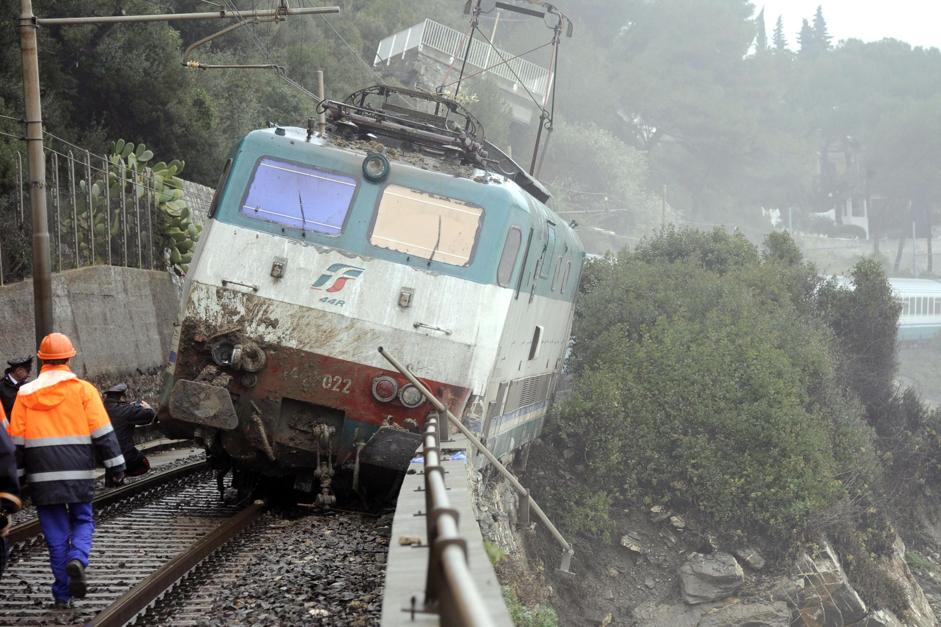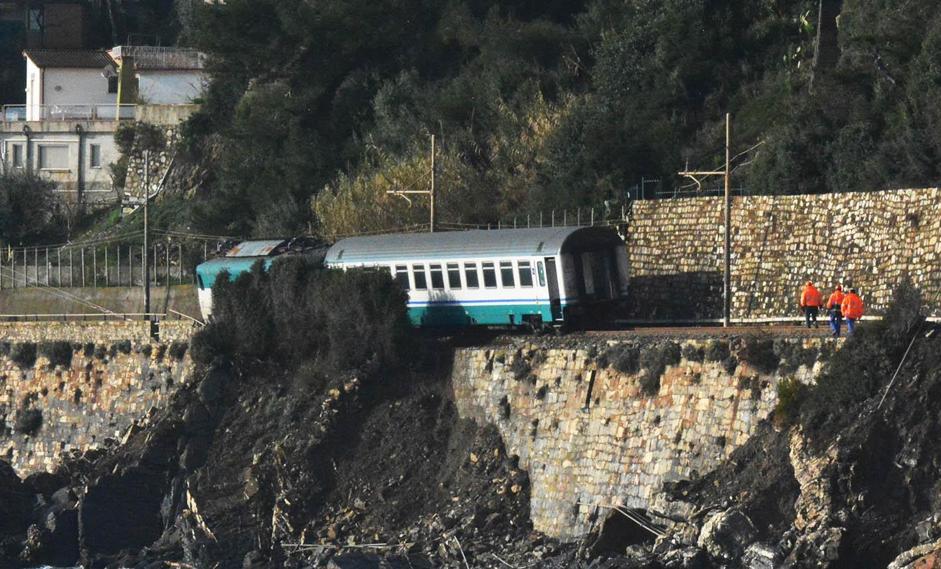 Restano ancora in bilico sulla massicciata ferroviaria il locomotore E444 e il primo vagone che erano deragliati dopo aver urtato contro la frana di Capo Rollo. Questi due saranno rimossi dalla chiatta sulla quale verranno montate le gru della Vernazza.