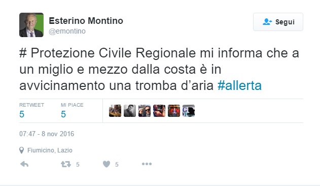 FIUMICINO – Allerta a Fiumicino sull’avvicinamento di una tromba d’aria. Lo ha reso noto su Twitter il sindaco Esterino Montino. “La Protezione Civile Regionale mi ha informato che a un miglio e mezzo dalla costa è in avvicinamento una tromba d’aria, all’altezza di Fiumicino. Si invitano i cittadini all’allerta, a restare il più possibile attenti rispetto a possibili pericoli e a limitare gli spostamenti”. L’allarme è rientrato in serata.