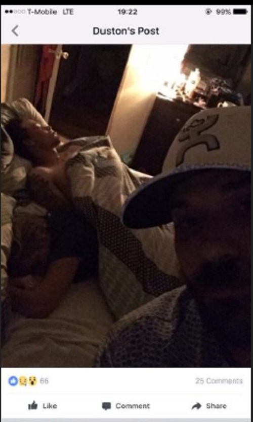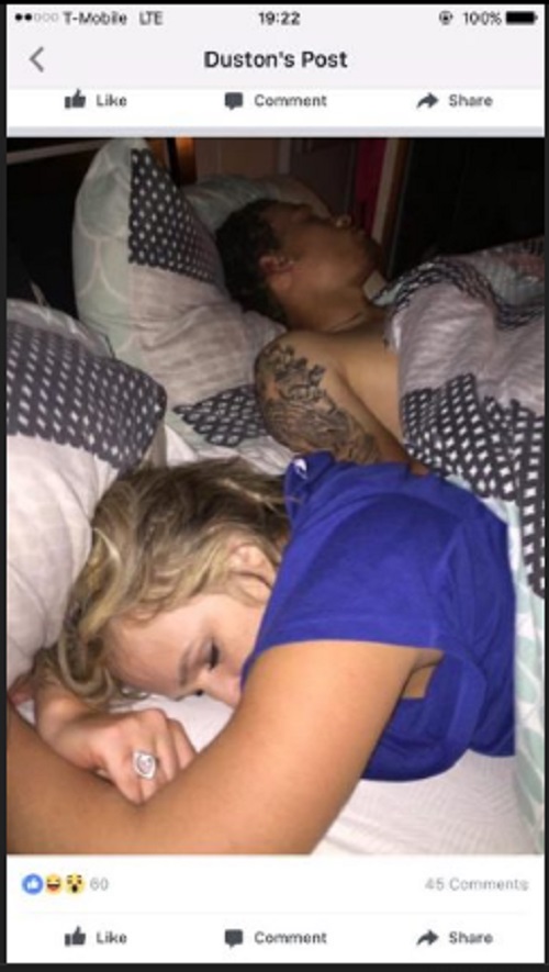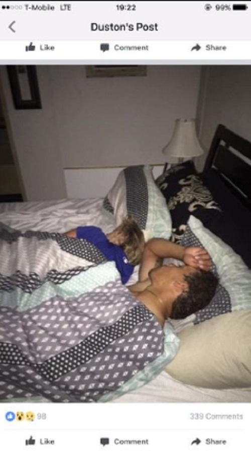 Non si sa se si sia trattato dell’amante di lei oppure no. Fatto sta che Duston l’ha presa con ironia e si è scattato dei selfie che ritraggono il suo viso con dietro quello della sua fidanzata e dell’uomo misterioso che dormono, per poi postarli su Facebook.