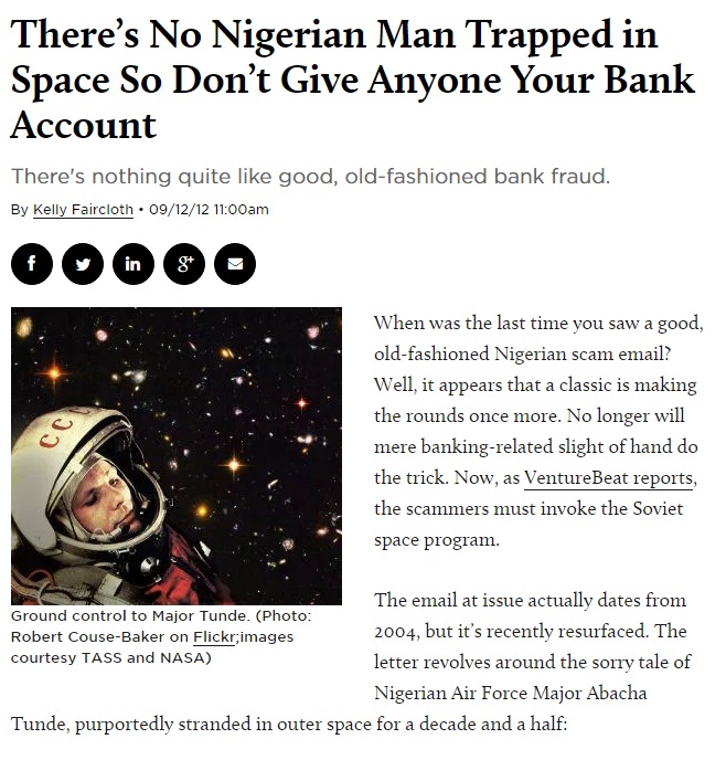 Nel messaggio c’è scritto che perso nello spazio c’è un astronauta nigeriano, Abacha Tunde, abbandonato sulla soyuz dai russi alla fine della Unione Sovietica. Il poveretto è in orbita da 14 anni senza mai toccare lo stipendio. La paga arretrata accumulata è ora di 30 milioni di dollari, ma per scendere sulla terra ne servono 3 di milioni. La richiesta è che il destinatario della lettera fornisca i dati del proprio conto corrente, in modo che i parenti dell’astronauta possano fare trasferire lì il denaro arretrato, cosa che loro non possono fare in quanto dipendenti pubblici.