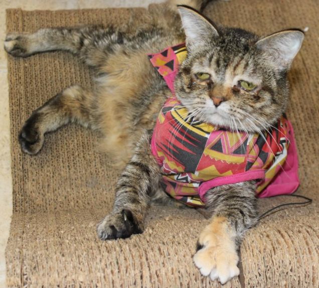 Inoltre la sua pelle è molto delicata e soggetta alla formazione di lividi e alla perdita del pelo, tanto che la gatta deve portare sempre un vestito che la protegga, come ha spiegato Connie Gabelei, la responsabile del rifugio per gatti ‘Purrfect Pals‘, che ha avuto in cura Tucker per un anno.