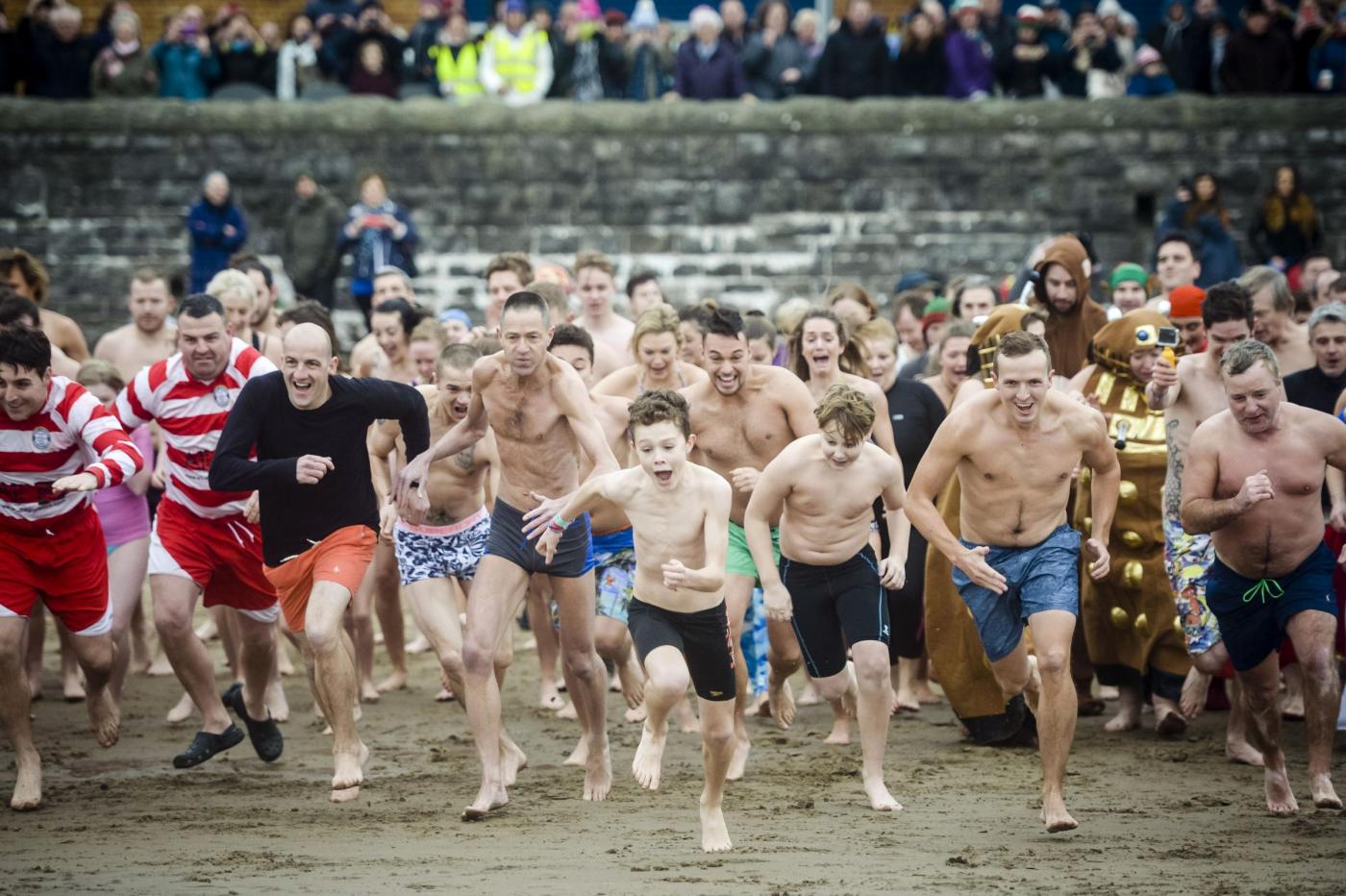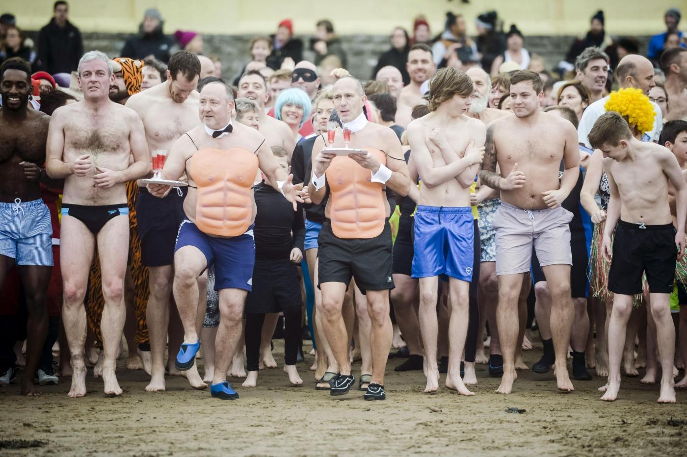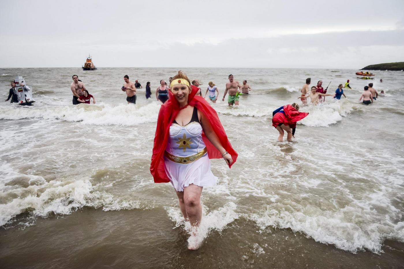 “Al suono della sirena, a mezzogiorno esatto, tutti in acqua tra urla scaramantiche e spruzzi di schiuma di un mare a 14 gradi di temperatura. Per la maggior parte dei partecipanti il “bagno” è durato pochi secondi, giusto il tempo per dimostrare il dovuto coraggio e richiamare la buona sorte per il nuovo anno. A riva, inevitabile ricorso a enormi asciugamani, accappatoi, berretti, coperte e fiumi di bevande calde”.