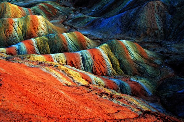 Si tratta di una zona a bassa piovosità che si trova vicina al deserto del Gobi. La loro composizione fa venire in mente le bottiglie di sabbia colorata tipiche di località di mare come Sharm El Shaik in Egitto. I diversi colori sono frutto di un continuo deposito di minerali che hanno una pigmentazione diversa.