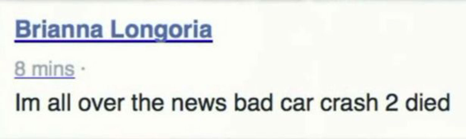 Conducente e passeggero dell’altra auto sono morti sul colpo, mentre Brianna e le amiche sono state trasportate in ospedale con ferite di lieve entità. Dopo l’incidente la diciottenne è tornata a casa e ha scritto su Facebook: “Sono su tutti i telegiornali, c’è stato un terribile incidente, 2 morti”.