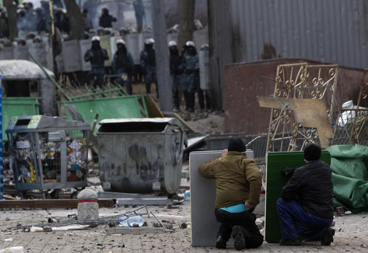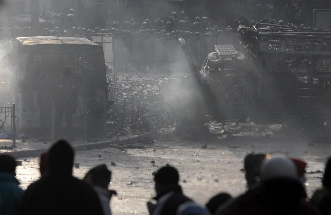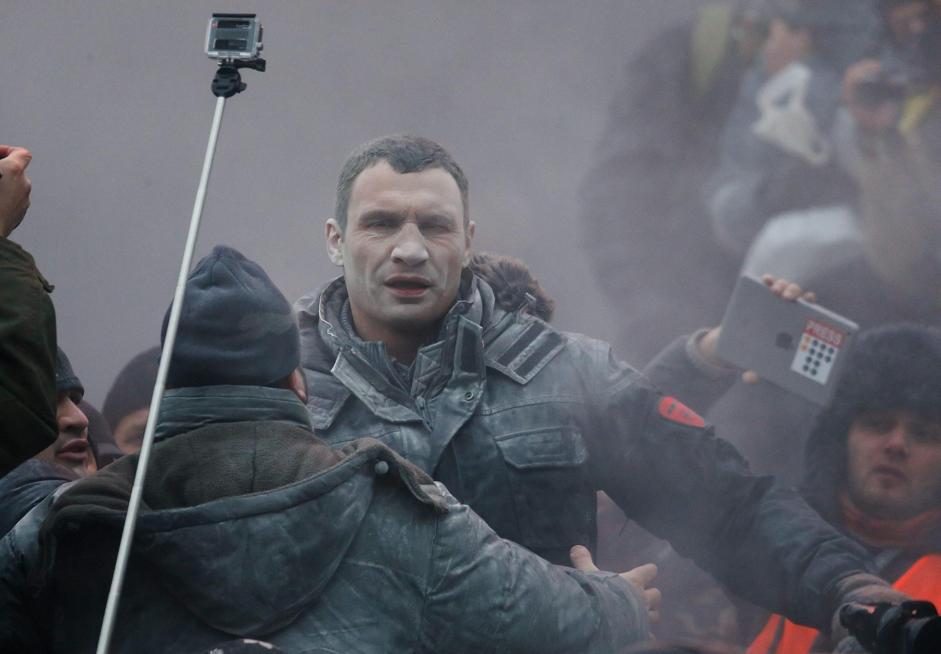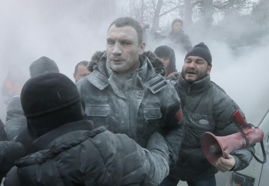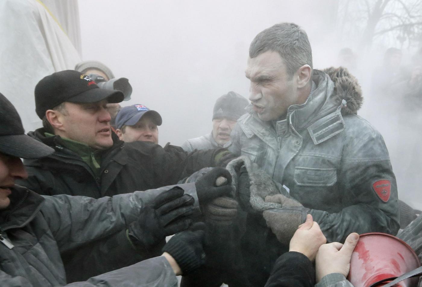Il pugile Vitali Klitschko è uno dei leader dell’opposizione ucraina. Nelle foto pubblicate dall’Ap, lo sportivo appare tutto bianco per colpa di un estintore usato dalla polizia insieme ai cannoni d’acqua. Klitschko ha detto di non escludere che possa scoppiare una guerra civile se il governo non smetterà di ricorrere alla violenza come strumento per mettere fine alla crisi politica. Da quasi due mesi migliaia di manifestanti protestano contro il governo e contro la decisione di non firmare un accordo di associazione con l’Ue per riavvicinarsi a Mosca.