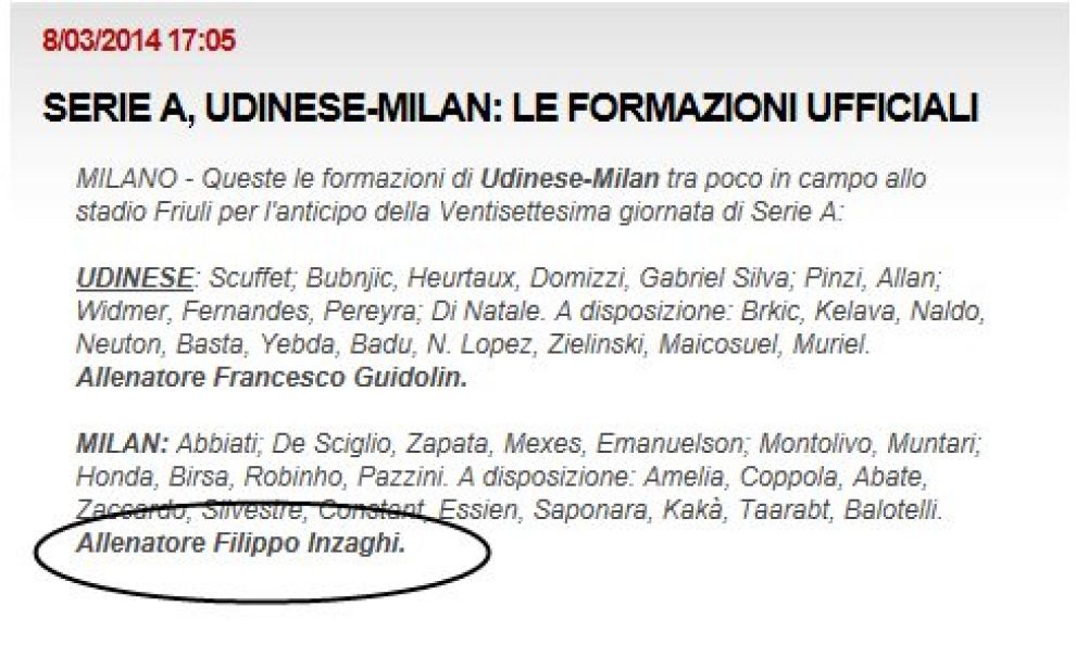 UDINE, STADIO FRIULI – Prima del fischio d’inizio di Udinese-Milan, c’รจ stata una gaffe clamorosa sul sito internet ย dei rossoneri: nella formazione ufficiale in panchina sedeva Filippo Inzaghi – mister della Primavera – e non Clarence Seedorf, allenatore della prima squadra.