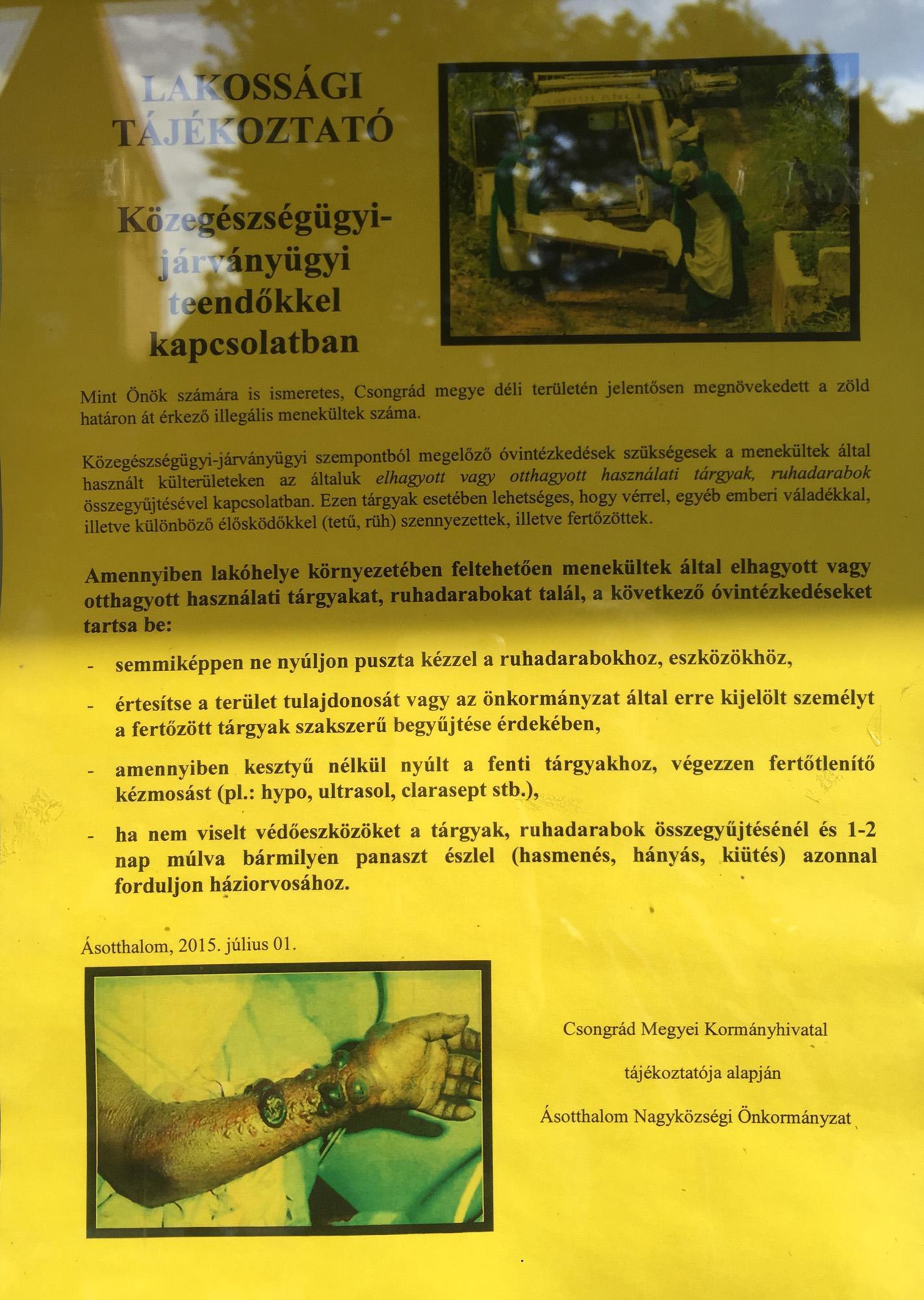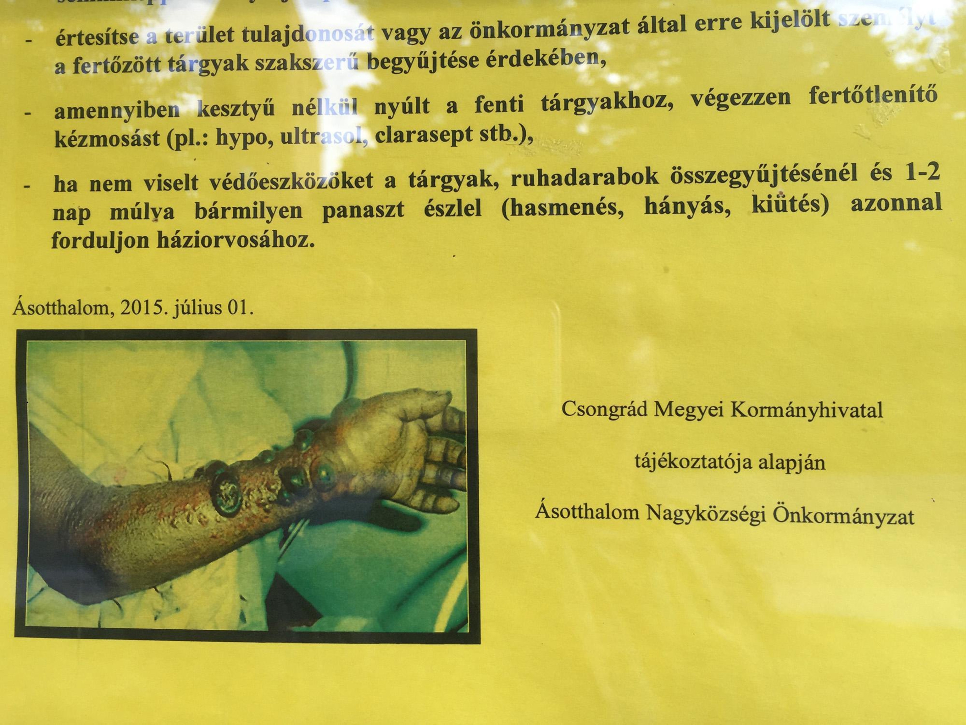 ASOTTHALOM (UNGHERIA) – Dopo lo spray urticante contro i migranti e la reporter che fa lo sgambetto, arriva la foto choc con il braccio pieno di piaghe. L’avviso choc sarebbe apparso a Asotthalom, confine tra Ungheria e Serbia. Si tratta di un manifesto incollato alle stazioni dei bus mette in guardia dal “rischio contagio dalle malattie dei migranti”.