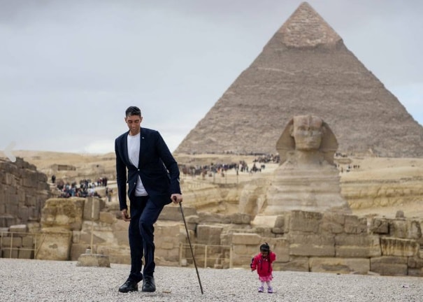 GIZA – L’indiana Jyoti Amge è la donna più bassa del mondo, il turco Sultan Kosen è invece l’uomo più alto del mondo. L’insolita coppia è in viaggio insieme alle Piramidi di Giza, in Egitto, per promuovere il turismo nel Paese.