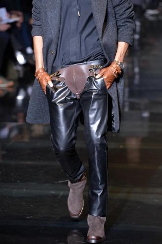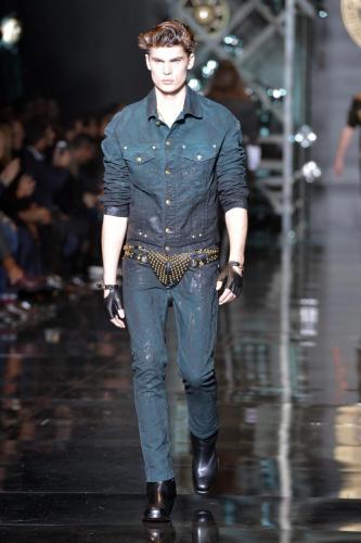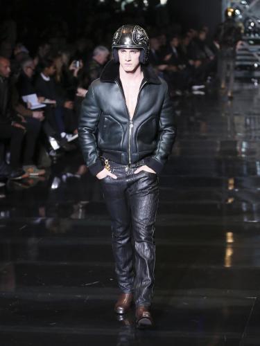 Per questa nuova “Versace generation” i biker sono i nuovi cowboy, così l’ispirazione western si mescola a uno stile metropolitano. Il completo formale ha la giacca con applicazioni dorate a motivo di ferro di cavallo, cactus e stella da sceriffo, e si porta con la camicia bianca aperta sul dolcevita nero e gli stivali da biker. Anche la nuova stampa di stagione ha motivi che ricordano le moto, ma anche le auto e gli orologi, e si posa sulle camicie sempre portate sui dolcevita, abbinate ai pantaloni di pelle impunturata, a quelli dipinti a mano o ai jeans spalmati come se fossero sporchi di grasso del motore. La moto torna come applicazione (ma si può anche togliere) sul pull rosso abbinato al cappotto dello stesso colore.