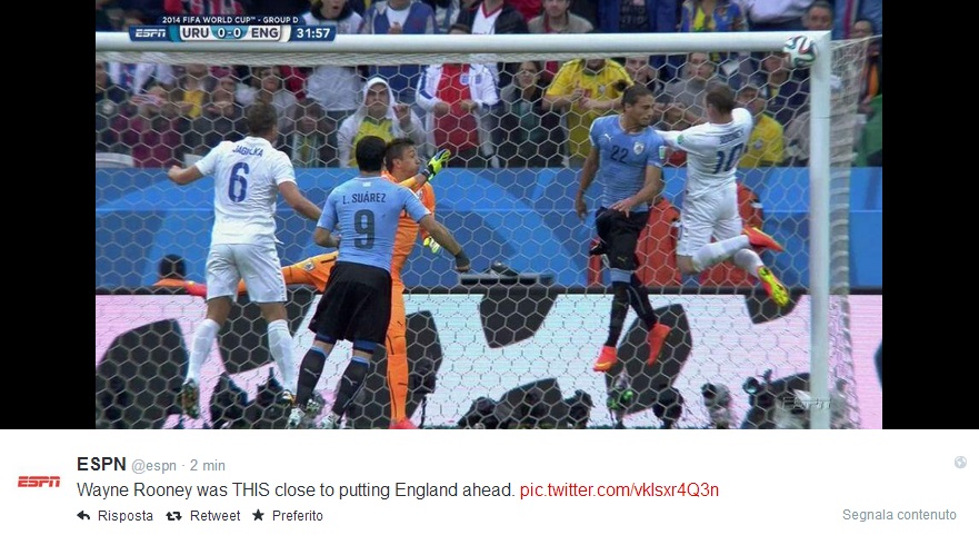 30′ – Traversa di Rooney. Punizione per l’Inghilterra, batte Gerrard. Spiovente al centro, Muslera non esce ma Rooney di testa colpisce la traversa