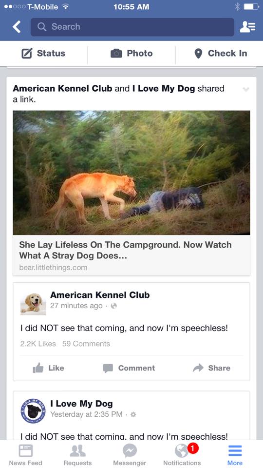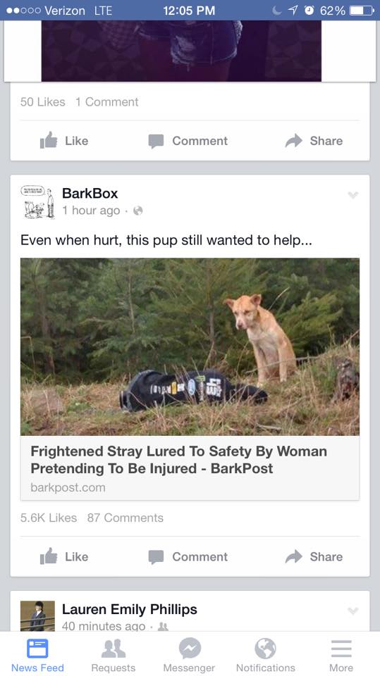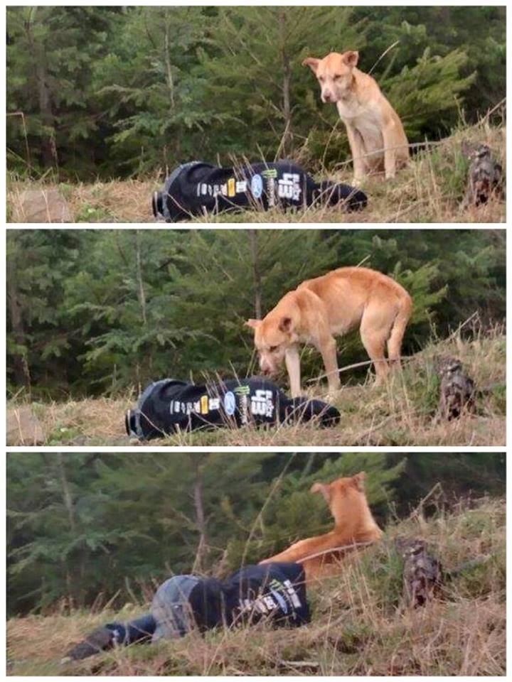 REDMOND (WASHINGTON, STATI UNITI) – Amanda e Dylan sono due volontari che lavorano per la protezione animali di Redmond nello Stato americano di Washington. Avendo saputo di un cane solitario che vive solo nel parco Evans Creek, i due decidono di fare qualcosa per lui. Armati di hot dog, si recano nel posto in cui il cane è stato avvistato. Vedendo che il cane è comunque diffidente e non si avvicina troppo, Amanda decide di sdraiarsi a terra fingendosi svenuta.