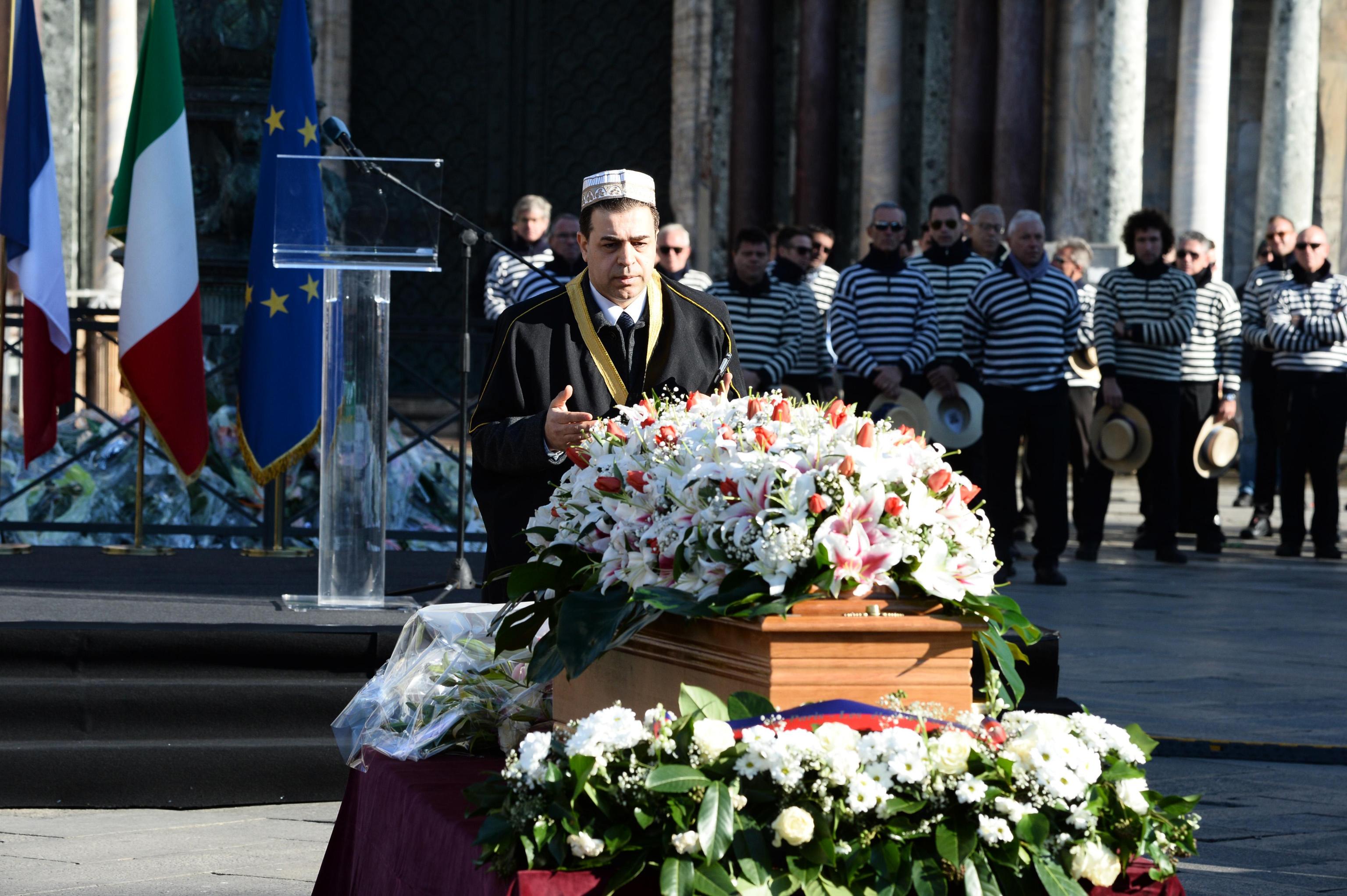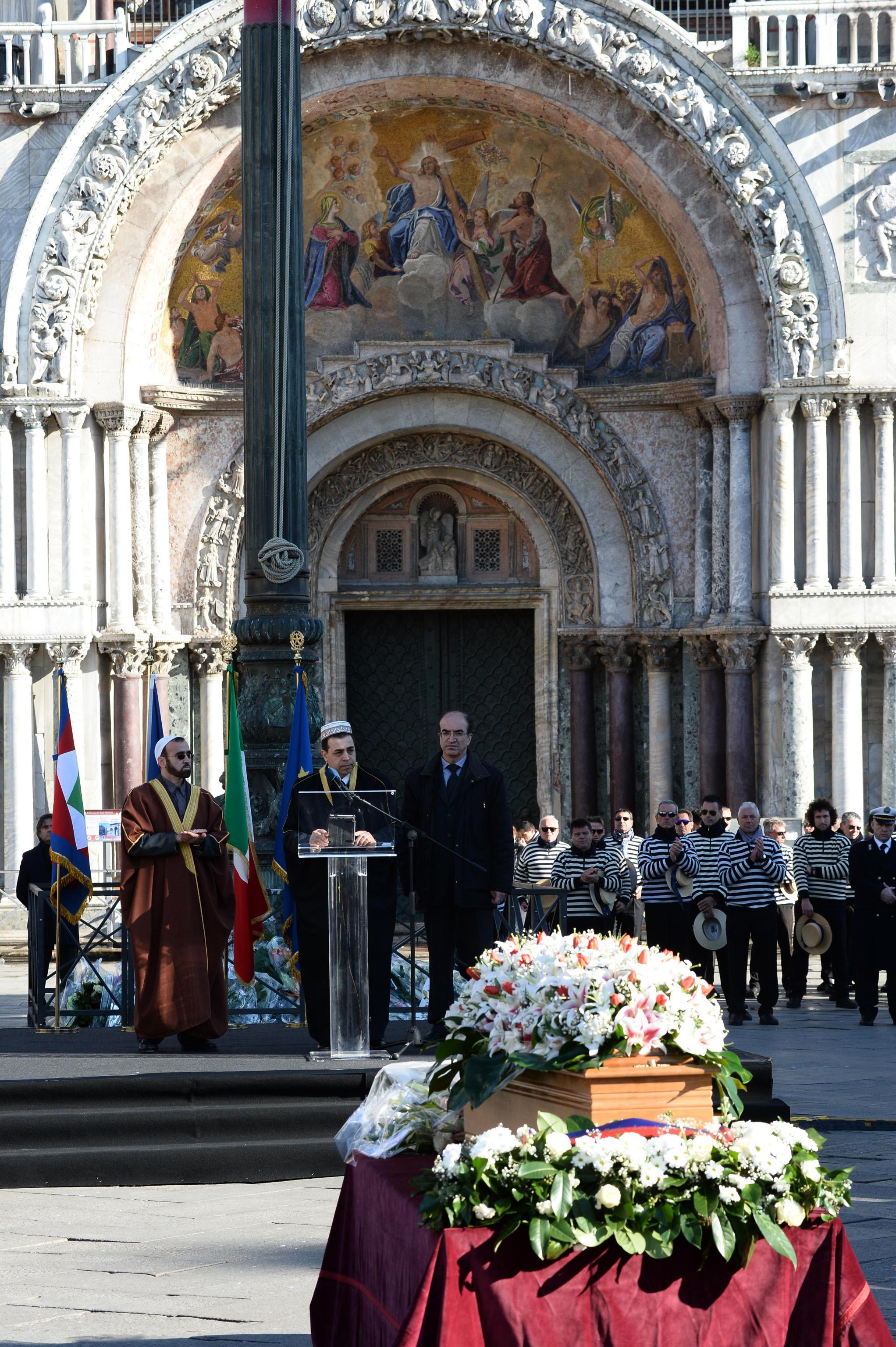 Un palco semplice, allestito in un’assolata piazza San Marco, davanti alla bara di legno chiaro ricoperta di gigli e rose arancioni. Prendono la parola gli amici e i parenti e, per volere dei genitori di Valeria, i rappresentanti delle religioni cattolica, ebraica, musulmana.