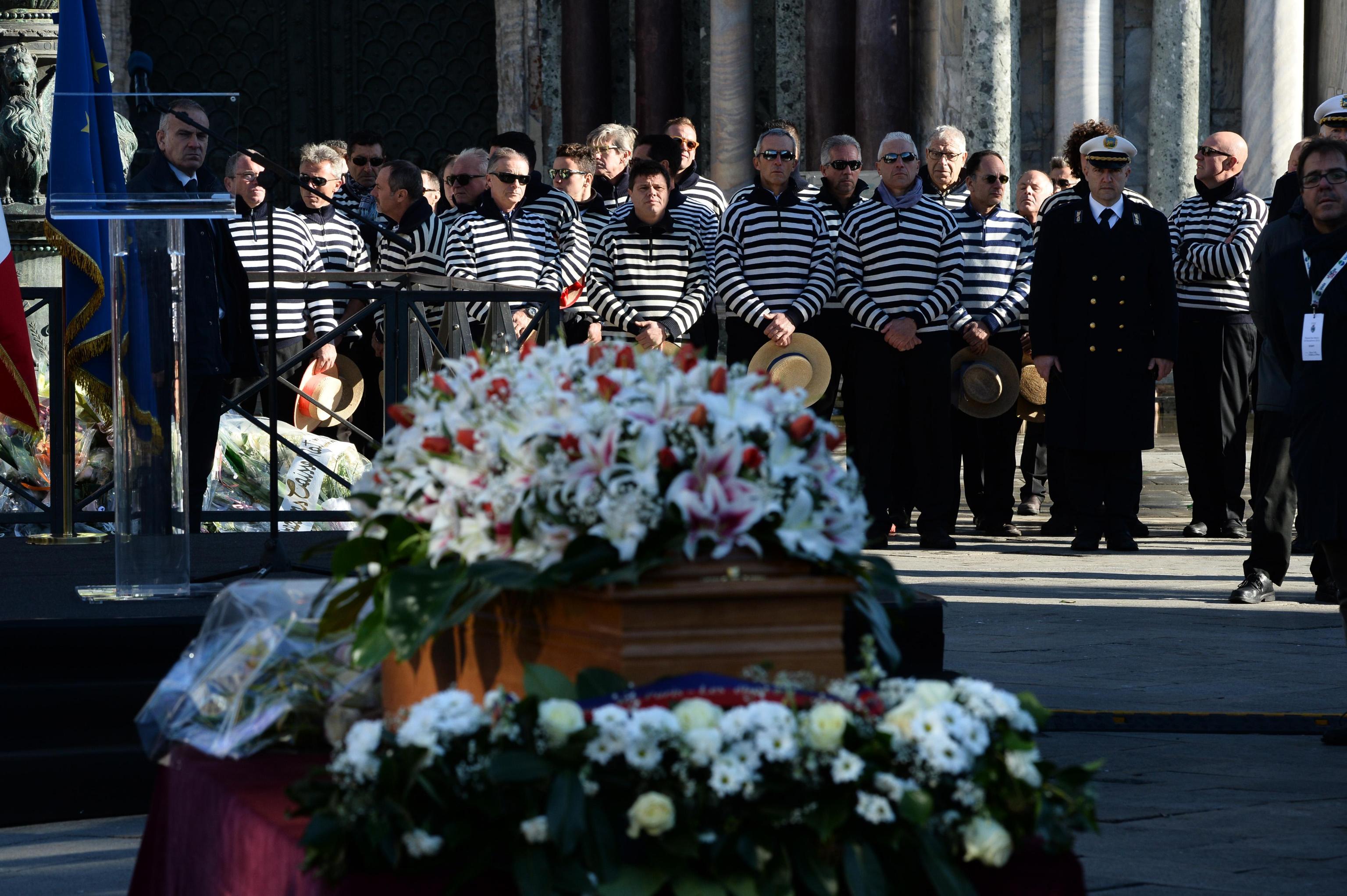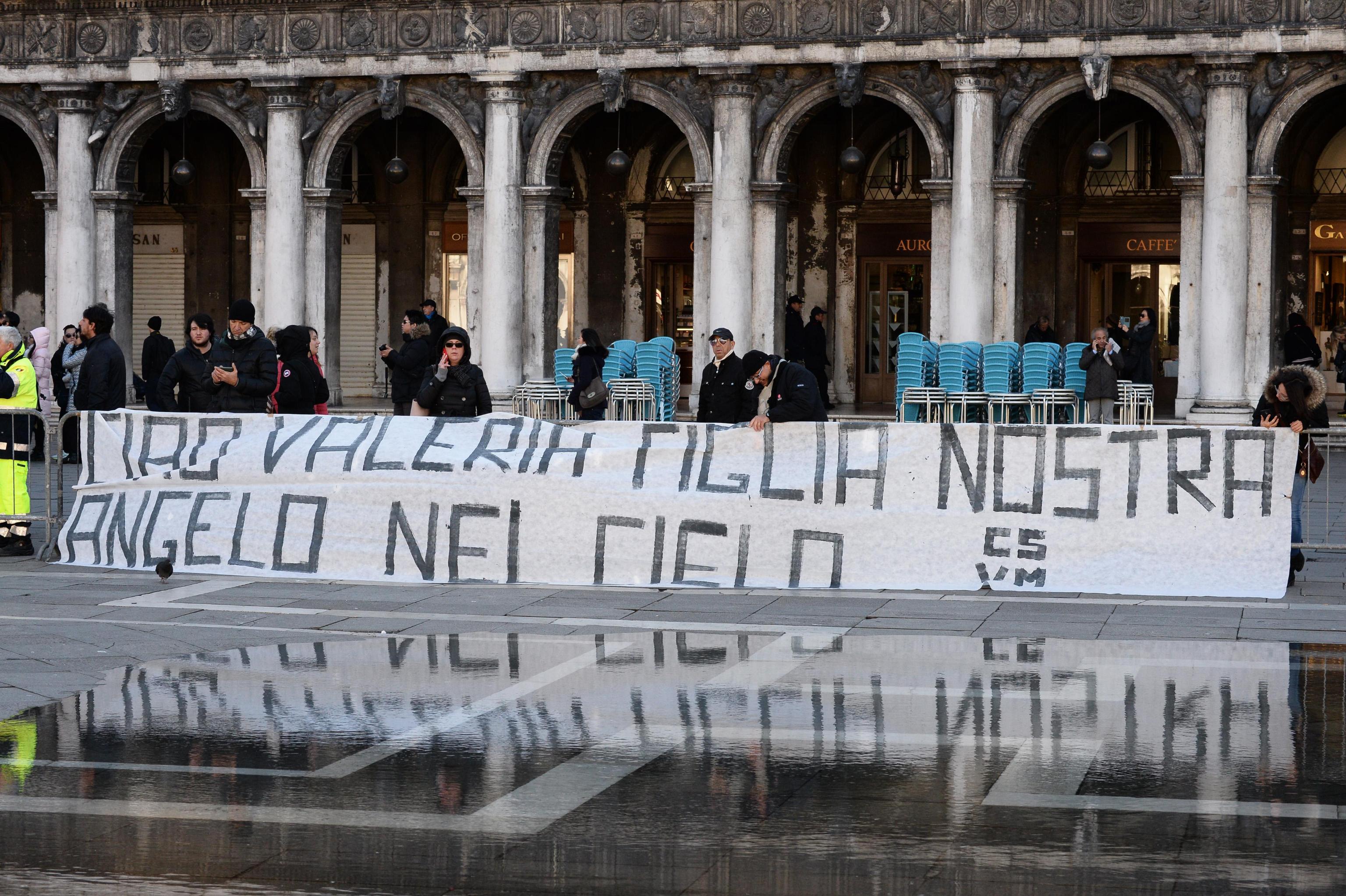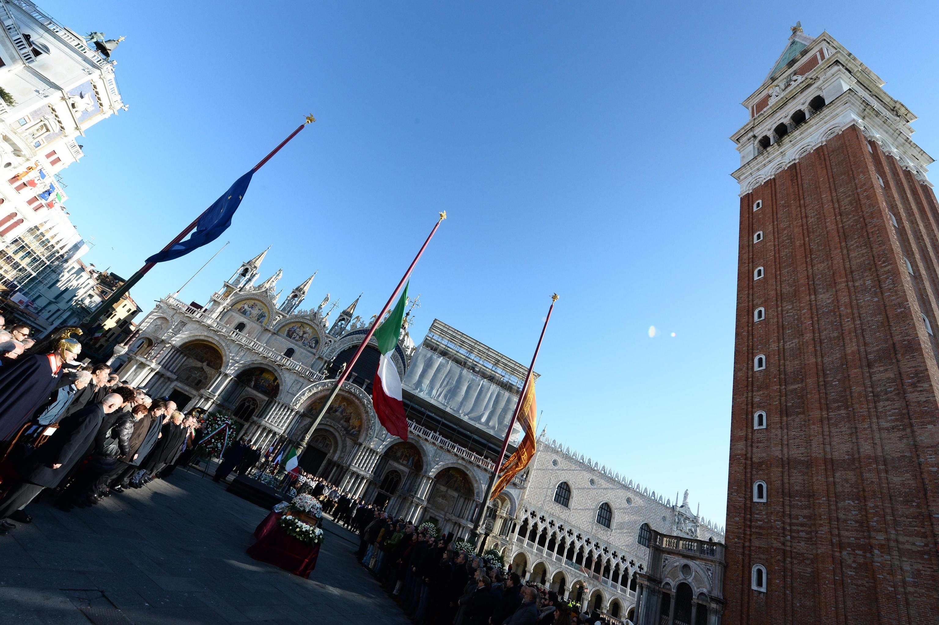 Durante la cerimonia è stato letto anche il messaggio di cordoglio del presidente francese François Hollande: ”Condivido il dolore della famiglia, famigliari e di tutta l’Italia. Valeria era venuta da noi in Francia per amore della vita e della cultura e ha trovato la morte sotto il fuoco dei terroristi”. Il feretro arriva a piazza San Marco gremita di personalità anche politiche in gondola (foto Ansa):
