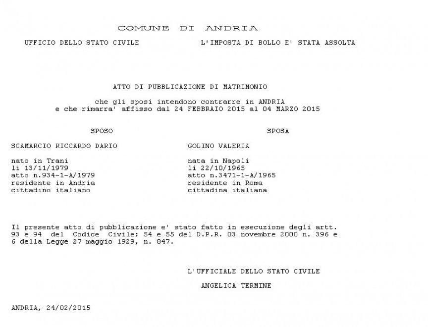 Dopo quasi dieci anni d’amore Valeria Golino e Riccardo Scamarcio si sposano. Le pubblicazioni sono da martedì sull’albo pretorio online del Comune di Andria, dove l’attore pugliese risiede da anni. Ancora sconosciuto, al momento, la location delle nozze. L’unica cosa certa è che sarà ad Andria, nell’amata Puglia.