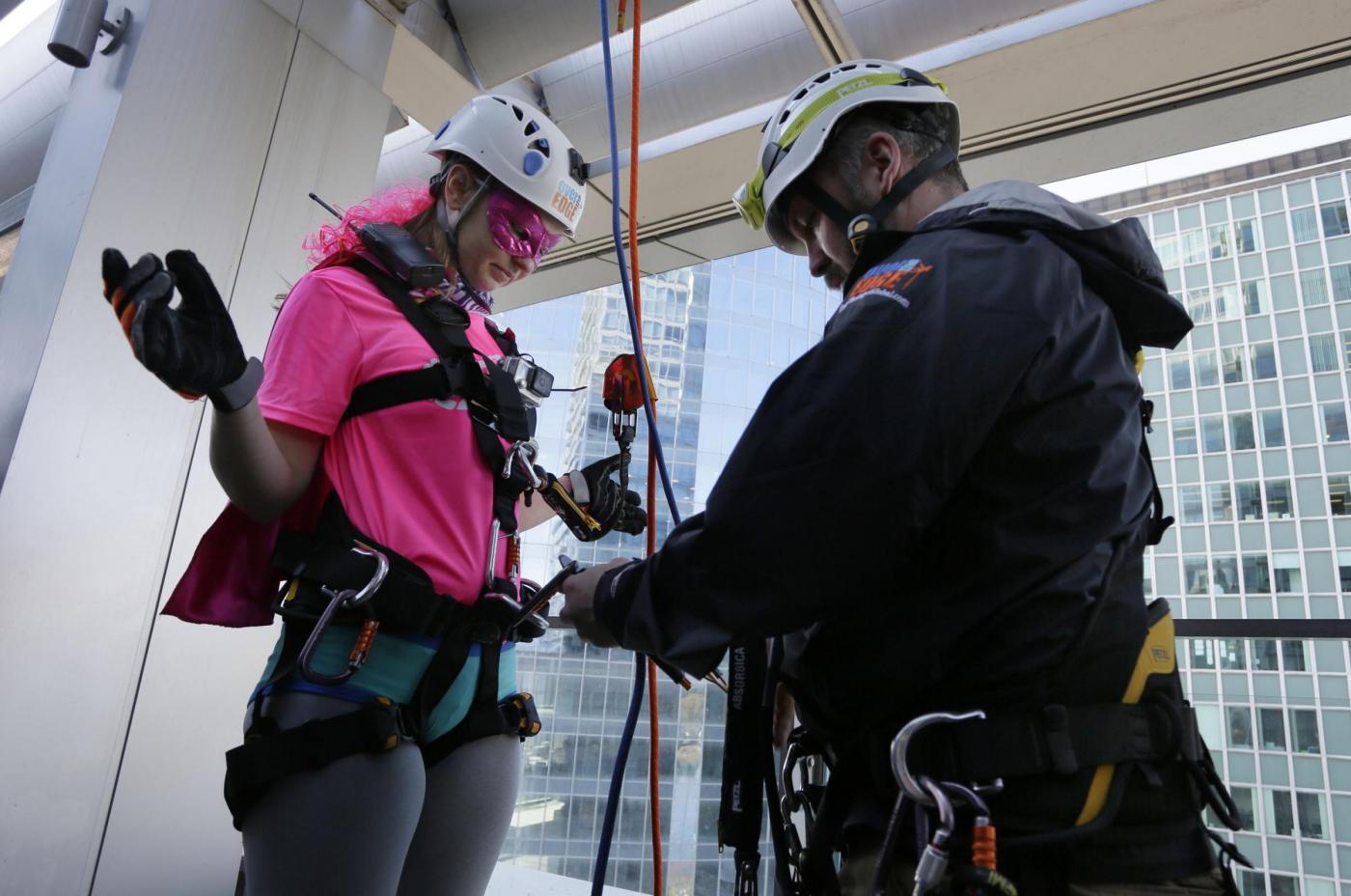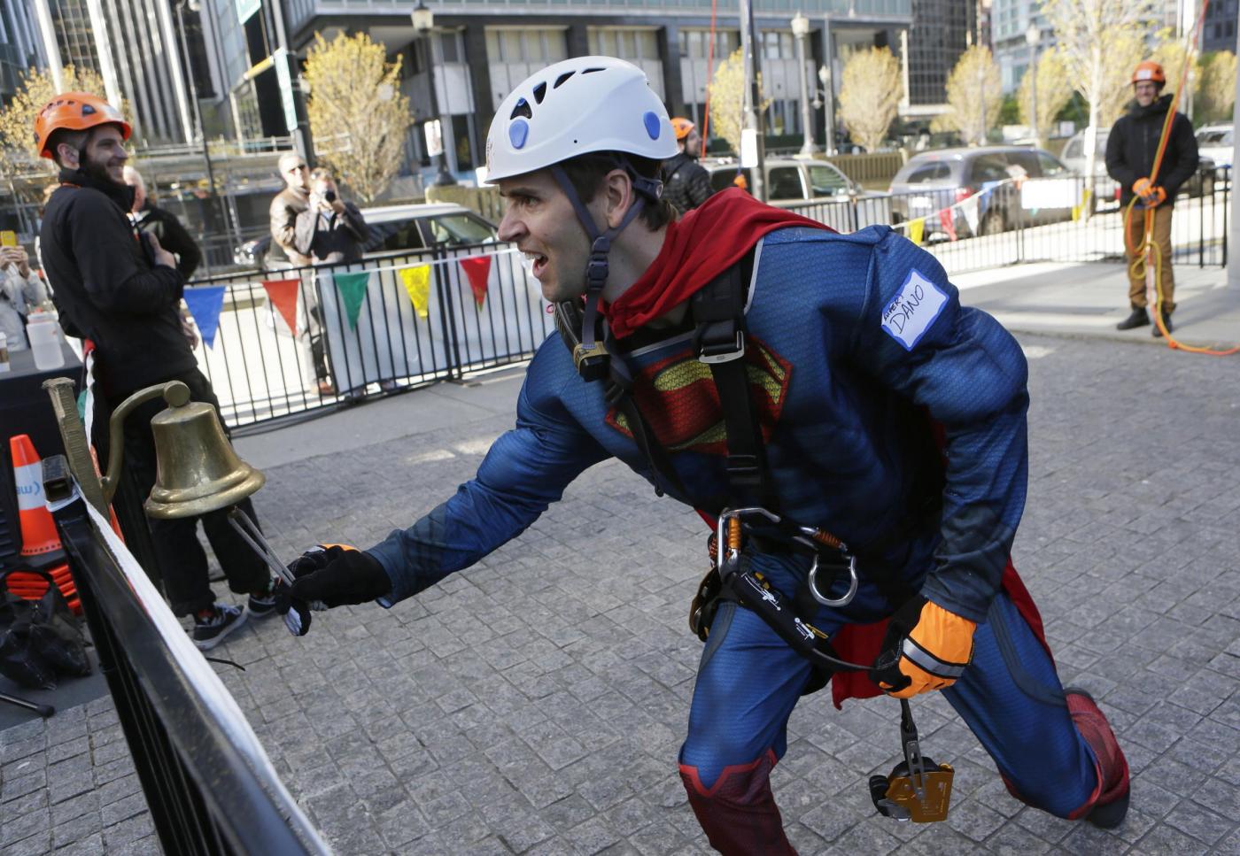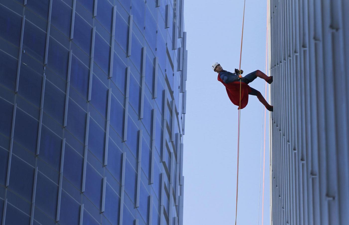Una manifestazione solidale ed anche divertente: gli sportivi che hanno partecipato si sono calati dallo Shaw Tower travestiti da supereroi. Le foto LaPresse.
