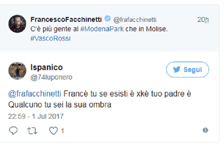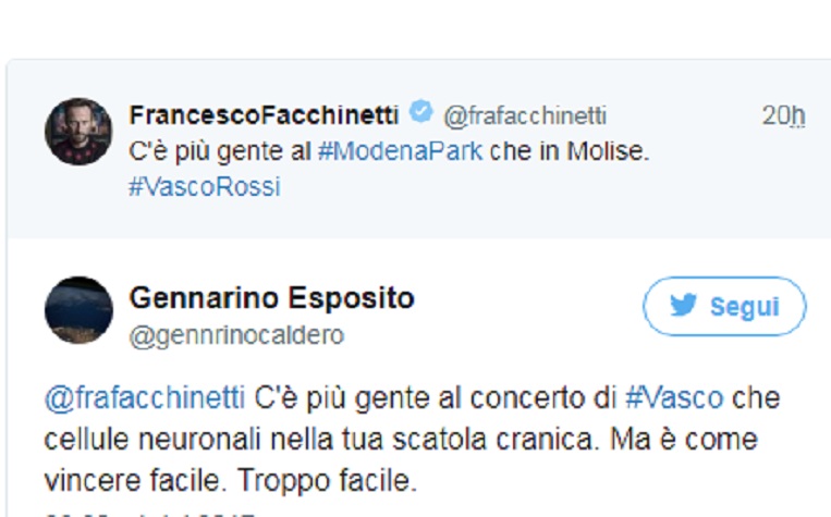 Tra i vari tweet anche quello di Gennarino Esposito che scrive: “C’è più gente al concerto di #Vasco che cellule neuronali nella tua scatola cranica. Ma è come vincere facile. Troppo facile” e chi lo accusa di esistere solo perché “tuo padre è Qualcuno tu sei la sua ombra”.