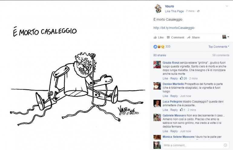 Non è di certo la prima volta che il vignettista prende di mira il ministro Boschi. E’ di un paio di settimane fa la vignetta che mostrava la Boschi nell’atto di fare pipì in piedi. Sempre Vauro aveva causato fortissime polemiche con la sua vignetta pubblicata il giorno successivo alla morte di Gianroberto Casaleggio. Nel disegno veniva immortalato un Beppe Grillo burattino, maldestramente a terra, con tutti i fili della marionetta rotti. Un modo non esattamente sobrio, viste anche le circostanze, per definire il portavoce del Movimento Cinque Stelle come una marionetta nelle mani di Casaleggio.