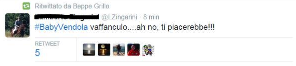 Chi gestisce l’account twitter di Grillo deve aver agito in automatico e ha rilanciato tutti i tweet che prendevano di mira Vendola, senza rendersi conto del loro contenuto. Eccone due che sono stati poi rimossi dal social network ma che l’Unità ha pubblicato prima che sparissero definitivamente dalla rete.