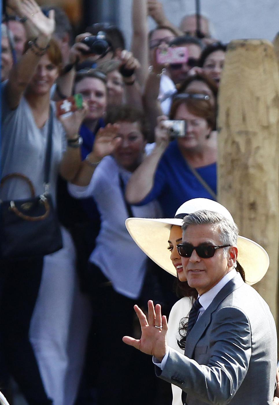 Oltre ai dipendenti comunali, fuori Ca’ Farsetti c’è anche una folla di curiosi in attesa dell’arrivo del divo di Holywood e la moglie avvocato (foto LaPresse)