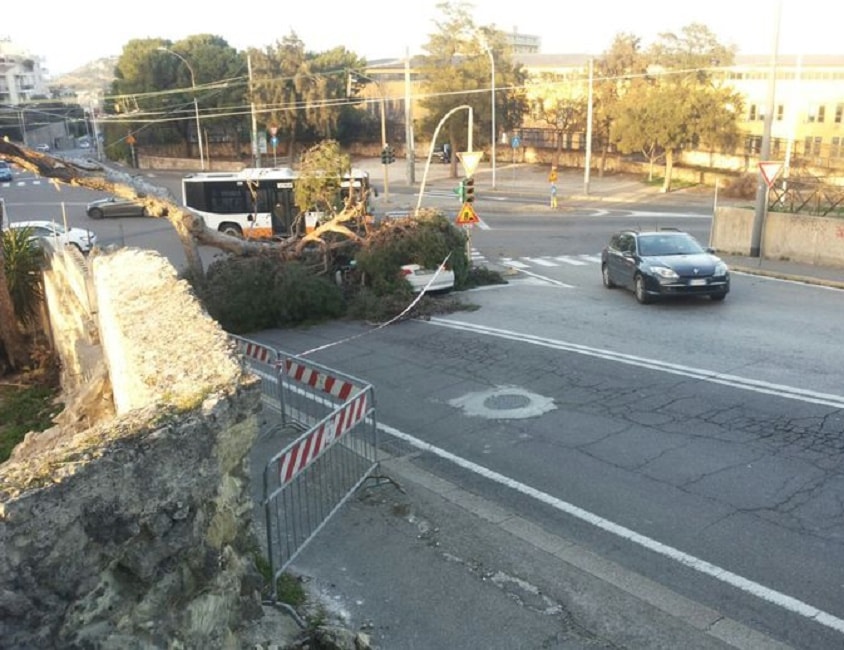 A causa del vento, con raffiche fino a 100 chilometri all’ora, altri alberi e rami sono caduti in viale Merello, via Dante e a San Michele sempre nella giornata di domenica; pali dell’illuminazione e semafori pericolanti lungo la Statale 554; cassonetti su vetture in diverse zone della città. Centinaia le chiamate ai centralini di vigili del fuoco e polizia municipale per segnalare disagi e chiedere interventi (foto Ansa).