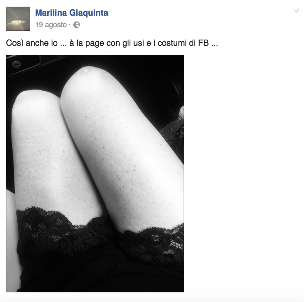 CATANIA – Posta sulla propria pagina Facebook una foto delle sue gambe sotto una sottoveste di pizzo nero: “Ha messo alla berlina le proprie gambe in una discutibile posa con connotazioni conturbanti”. L’accusa arriva dal sindacato di polizia autonomo “Poliziotti democratici riformisti” ed è rivolta a Marilina Giaquinta, vice questore di Catania. Ma lei non si lascia intimidire e parla di un “attacco medievale”: “Se oggi fa scandalo la foto delle gambe di una donna allora siamo veramente a burqa e burkini”.