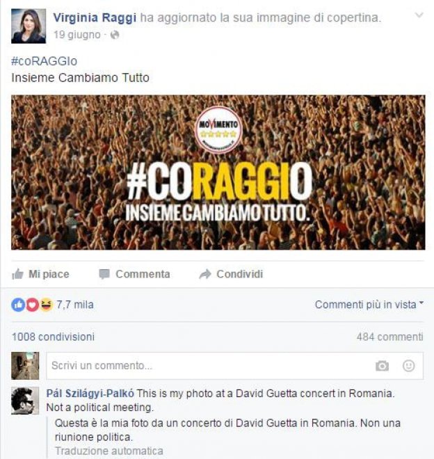 “Questa è una mia foto, fatta ad un concerto di David Guetta in Romania, non un comizio politico”, ha scritto il fotografo, Pál Szilágyi-Palkó, proprio sotto la foto postata da Raggi su Facebook.