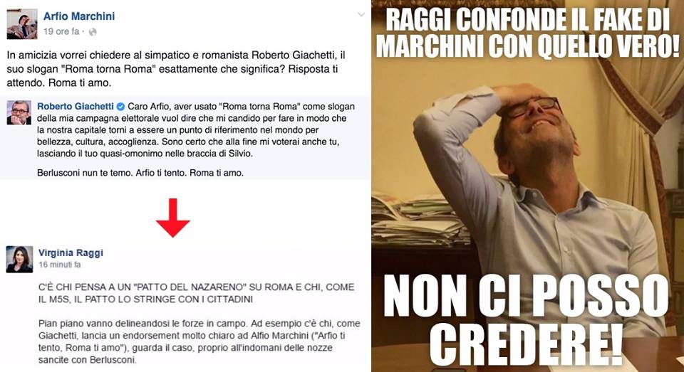 ROMA – Arfio Marchini, l’alter ego ironico di Alfio Marchini, provoca Roberto Giachetti. Lui risponde per davvero, ironicamente, a tono. Poi si inserisce Virginia Raggi ma pensa che Marchini sia quello vero, e che Giachetti voglia proporre un’improbabile alleanza. Salvo poi correggere il tiro e il post. Succede anche questo nella concitata campagna elettorale per le Comunali di Roma. Giovedì sera “Arfio” ha scritto: