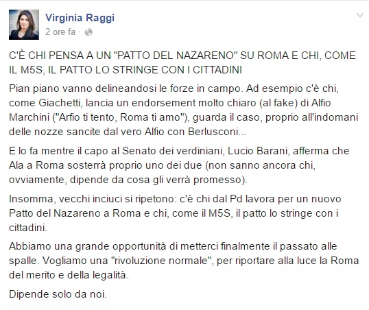 “C’È CHI PENSA A UN “PATTO DEL NAZARENO” SU ROMA E CHI, COME IL M5S, IL PATTO LO STRINGE CON I CITTADINI Pian piano vanno delineandosi le forze in campo. Ad esempio c’è chi, come Giachetti, lancia un endorsement molto chiaro (al fake) di Alfio Marchini (“Arfio ti tento, Roma ti amo”), guarda il caso, proprio all’indomani delle nozze sancite dal vero Alfio con Berlusconi… E lo fa mentre il capo al Senato dei verdiniani, Lucio Barani, afferma che Ala a Roma sosterrà proprio uno dei due (non sanno ancora chi, ovviamente, dipende da cosa gli verrà promesso). Insomma, vecchi inciuci si ripetono: c’è chi dal Pd lavora per un nuovo Patto del Nazareno a Roma e chi, come il M5S, il patto lo stringe con i cittadini. Abbiamo una grande opportunità di metterci finalmente il passato alle spalle. Vogliamo una “rivoluzione normale”, per riportare alla luce la Roma del merito e della legalità . Dipende solo da noi.”