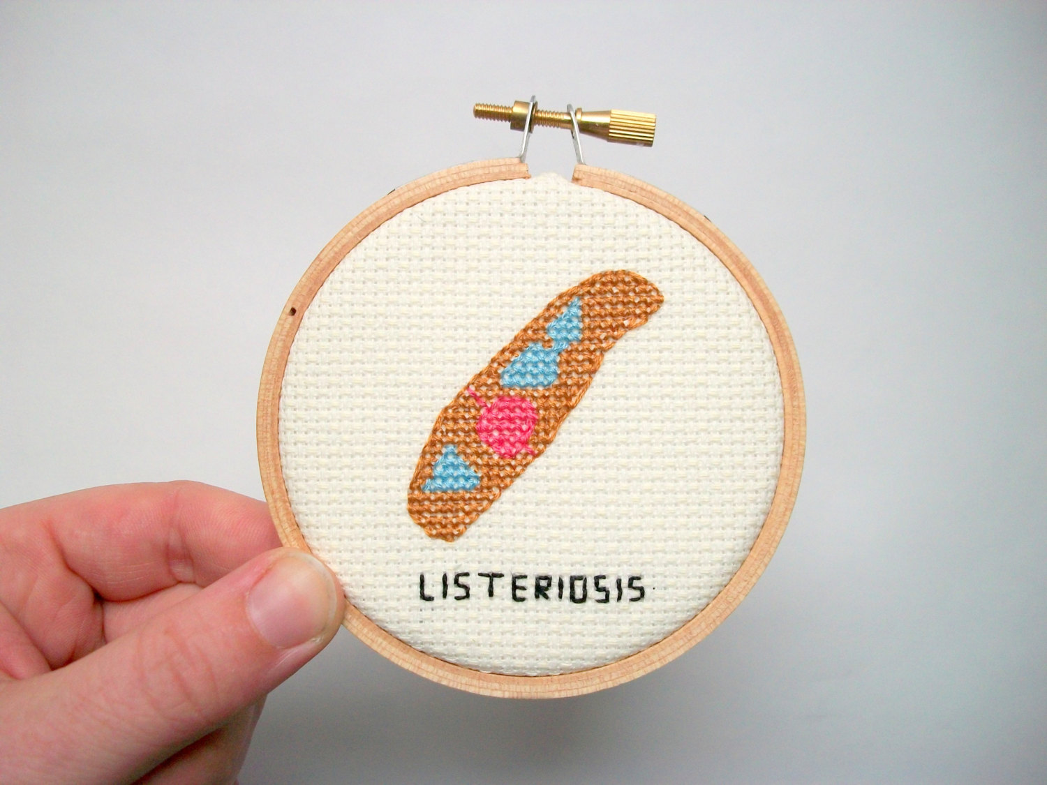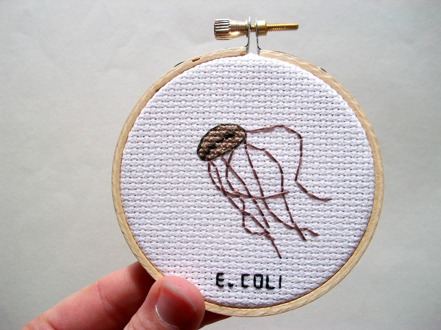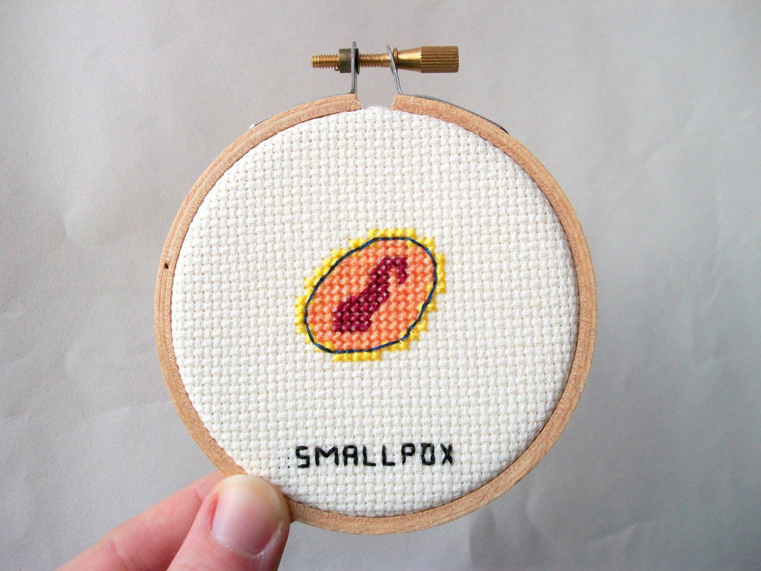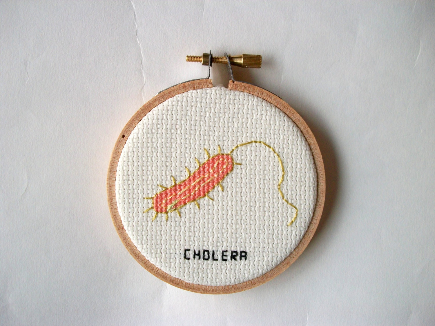“Watty’s Wall Stuff” è il negozio “Etsy” (sito web dedicato all’e-commerce in cui gli iscritti possono vendere prodotti artigianali oppure oggetti vintage n.d.r) di Alicia Watkins. Il tema di questa collezione realizzata nell’aprile scorso, è dedicata a virus e batteri patogeni che attaccano l’uomo. I piccoli ricami sono in vendita sul sito sia come oggetto finito che come kit completo di filati e cerchio in legno. Tre kit costano 20 euro.