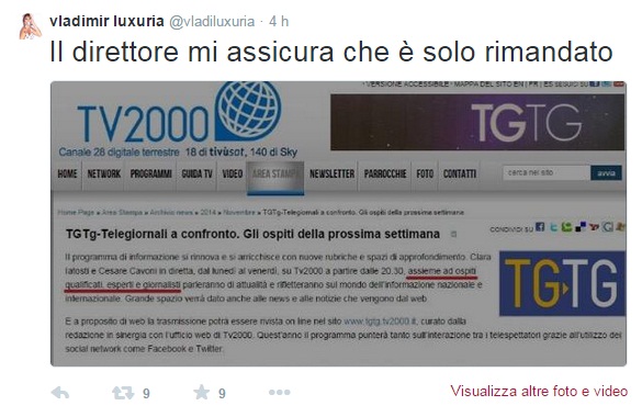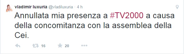D’altronde l’invito della Luxuria è stato rimandato perché in concomitanza con i lavori dell’assemblea della Cei. A rispondere a Luxuria è stato anche Lucio Brunelli, direttore delle News della tv dei vescovi: “La presenza di Vladimir Luxuria a Tv2000 rischiava di prestarsi a malintesi o strumentalizzazioni”.