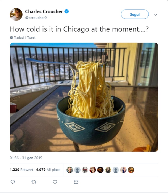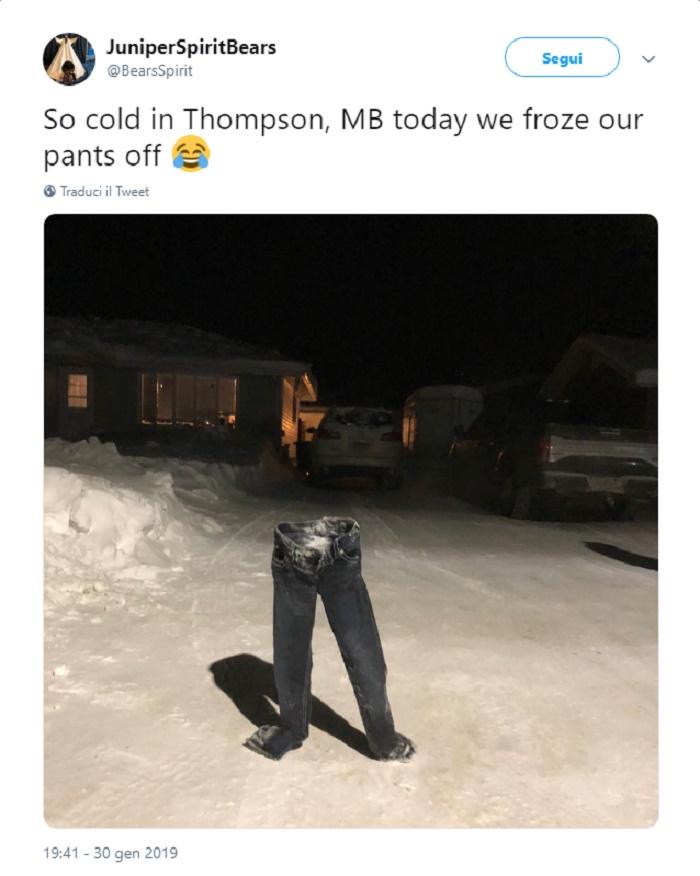 Sui social network però non è mancata la creatività nell’affrontare il freddo. C’è chi lancia in aria acqua bollente mostrando come diventi ghiaccio all’istante, chi invece utilizza l’effetto del ghiaccio per tenere in piedi pantaloni bagnati o ancora forchette, come se vi fosse un fantasma. Il trucco è semplice ma di grande effetto: portare all’esterno un oggetto bagnato e con temperature calde così che la violenta escursione termica con l’ambiente lo congeli all’istante.