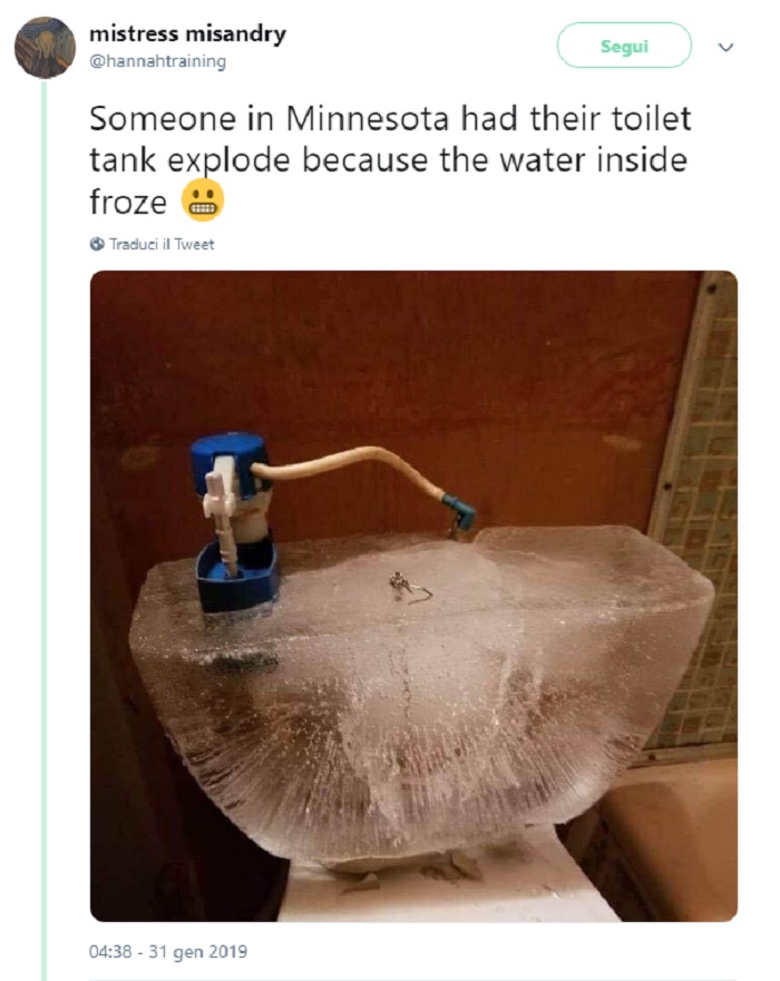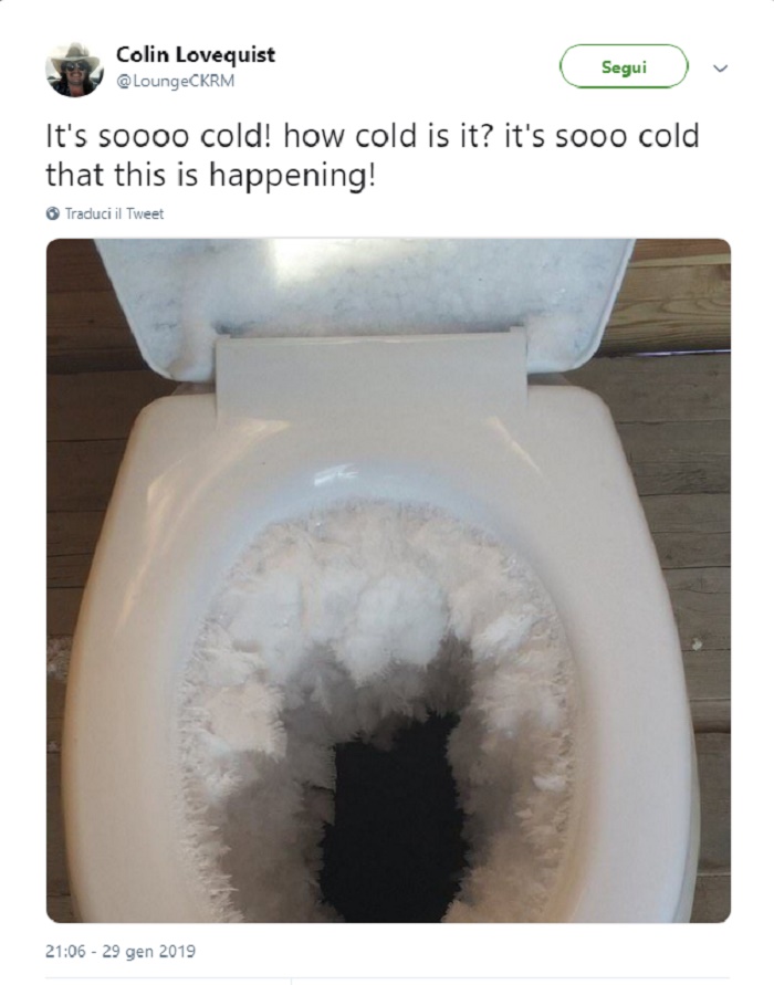 Se l’emergenza incombe, soprattutto negli Stati del Midwest come Wisconsin, Michigan e Illinois, non mancano i cittadini che utilizzano l’ironia per affrontare l’inaspettato e insopportabile gelo. Si stima che l’ondata di freddo colpirà 250 milioni di americani e che 90 milioni sperimenteranno temperature sotto lo zero: 20 milioni saranno messi a dura prova da un termometro che scenderà a -28 o oltre entro la fine della settimana. Le autorità hanno invitato a non uscire se non per strette necessità, anche per il rischio di ipotermia e congelamento quasi immediati, nel giro di pochi minuti. I dirigenti del meteo in Iowa hanno ammonito addirittura a “non respirare profondamente” all’esterno.