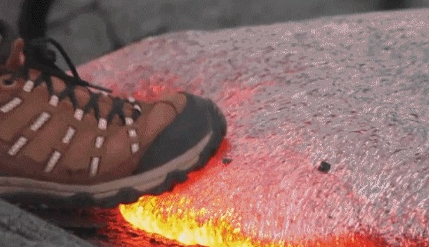 Nel video si vede la roccia calda sotto la scarpa che sembra avere una consistenza gommosa: una volta alzato il piede, sotto la scarpa si forma poi una piccola fiamma.