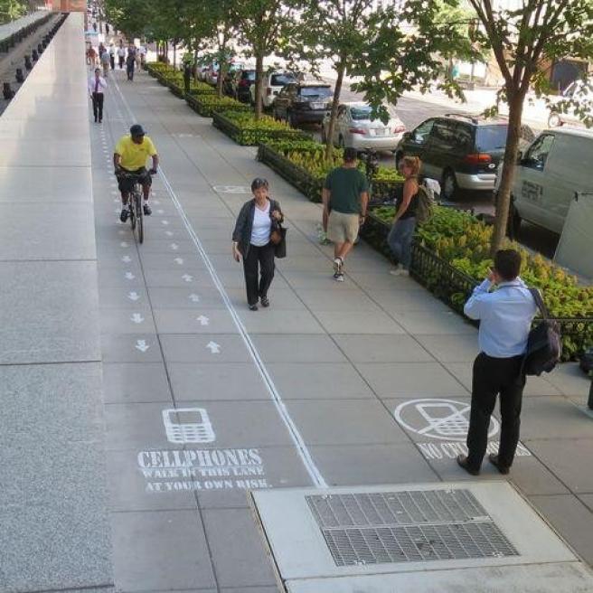 Il marciapiede della 18th Street Nortwest è diviso in due da una doppia linea continua: da un lato scivolano i pedoni a testa alta e i ciclisti, dall’altra i maniaci dello smartphone. Un avviso all’avvio informa: “Cellulari, camminate da questa parte a vostro rischio e pericolo”. E per rendere più agevole la passeggiata una lunga serie di frecce sono disegnate sull’asfalto per guidare il pedone che non alza mai lo sguardo dal proprio display a seguire la giusta traiettoria.
