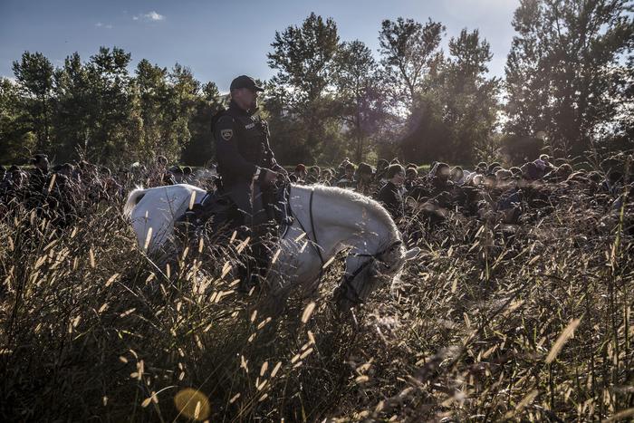A handout image provided by the World Press Photo (WPP) organization on 18 February 2016 shows a picture by Russian photographer Sergey Ponomarev for The New York Times that won First Prize Stories in the General News Category of the 59th annual World Press Photo Contest, it was announced by the WPP Foundation in Amsterdam, The Netherlands on 18 February 2016. The picture shows a Slovenian police officer on horseback escorting migrants after they crossed from Croatia. Under Europe’s system of open internal borders, the island’s thinly patrolled, easily accessible coastline, within sight of the Turkish coast, might as well be the frontier of France or Germany or Sweden. EPA/SERGEY PONOMAREV / WORLD PRESS PHOTO / HANDOUT ATTENTION EDITORS : EDITORIAL USE ONLY / NO SALES / NO ARCHIVE / NO CROPPING / NO MANIPULATING / USE ONLY FOR SINGLE PUBLICATION IN CONNECTION WITH THE WORLD PRESS PHOTO AND ITS ACTIVITIES HANDOUT EDITORIAL USE ONLY/NO SALES/NO ARCHIVES