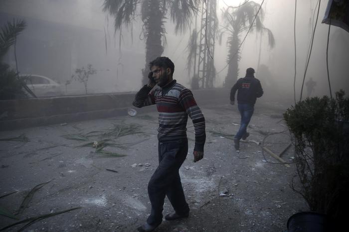 In this image released by World Press Photo titled “Aftermath of Airstrikes in Syria” by photographer Sameer Al-Doumy for AFP which won the first prize in the Spot News stories category shows a wounded man walking out of a dust cloud following reported airstrikes in the town of Hamouria, Syria, Dec. 9, 2015.(Sameer Al-Doumy/AFP, World Press Photo via AP)