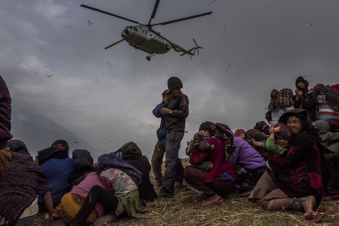 A handout image provided by the World Press Photo (WPP) organization on 18 February 2016 shows a picture by Australian photographer Daniel Berehulak for The New York Times that won Third Prize Stories in the General News Category of the 59th annual World Press Photo Contest, it was announced by the WPP Foundation in Amsterdam, The Netherlands on 18 February 2016. The picture shows Nepalese villagers looking on as they watch a helicopter picking up a medical team, dropping aid at the edge of a makeshift landing zone on May 9, 2015 in the village of Gumda, Nepal. On the 25th of April, just before noon local time, as farmers were out in fields and people at home or work, a devastating earthquake struck Nepal, killing over 8,000 people and injuring more than 21,000 according to the United Nations Office for the Coordination of Humanitarian Affairs. EPA/DANIEL BEREHULAK / WORLD PRESS PHOTO / HANDOUT ATTENTION EDITORS : EDITORIAL USE ONLY / NO SALES / NO ARCHIVE / NO CROPPING / NO MANIPULATING / USE ONLY FOR SINGLE PUBLICATION IN CONNECTION WITH THE WORLD PRESS PHOTO AND ITS ACTIVITIES HANDOUT EDITORIAL USE ONLY/NO SALES/NO ARCHIVES HANDOUT EDITORIAL USE ONLY/NO SALES/NO ARCHIVES