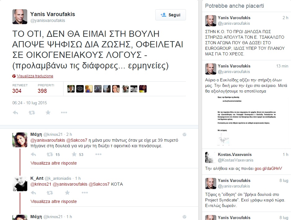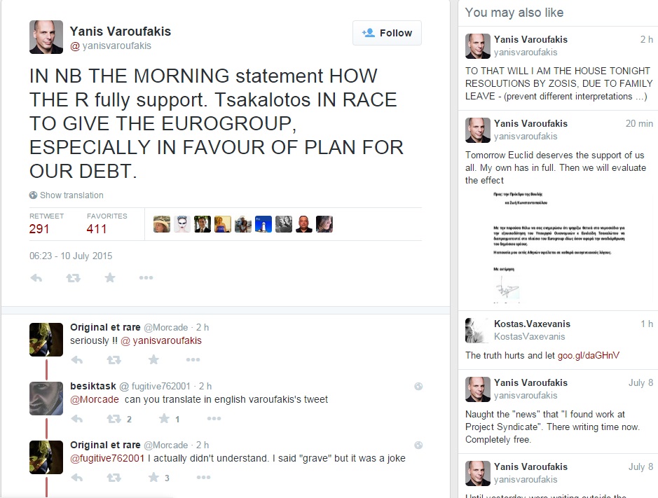 Nel primo tweet ha allegato la sua dichiarazione di questa mattina (venerdì 10 luglio) in favore del piano elaborato dal suo successore Tsakalotos. Nel secondo tweet ha spiegato di aver allegato la sua dichiarazione perché non sarà presente alla votazione e scrivendo tra parentesi di voler così “evitare differenti interpretazioni” della sua assenza. Nel terzo afferma che Tsakalotos “merita il sostegno di tutti noi. Il mio lo ha in pieno. Poi valuteremo l’effetto”.