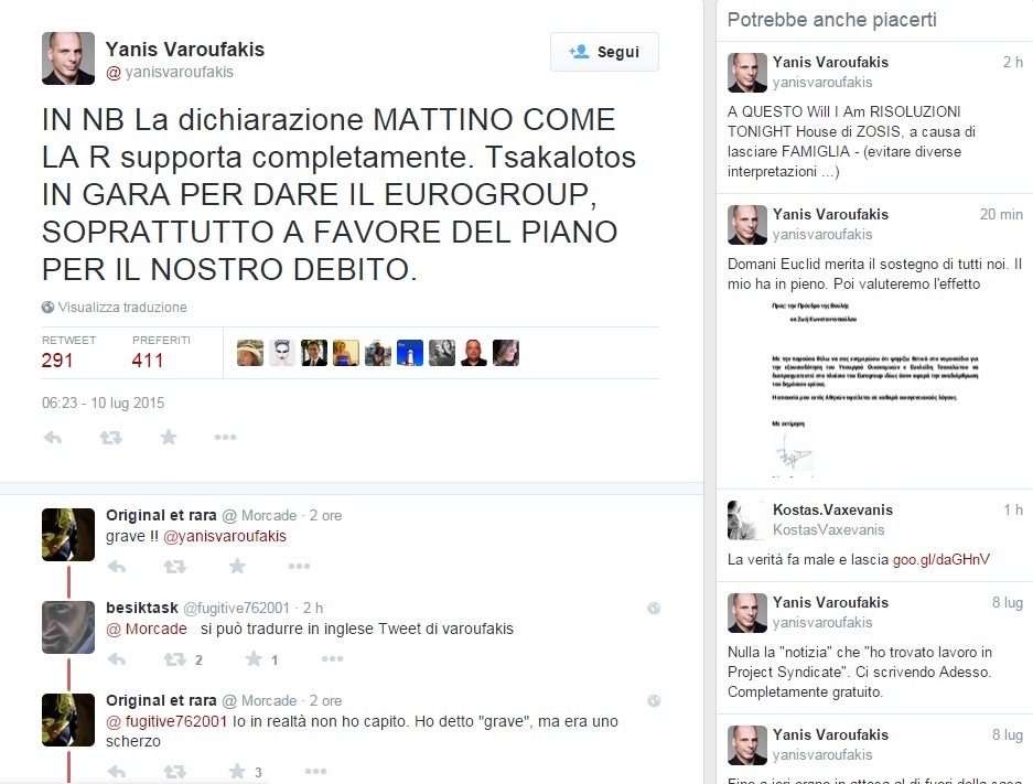 Nel primo tweet ha allegato la sua dichiarazione di questa mattina (venerdì 10 luglio) in favore del piano elaborato dal suo successore Tsakalotos. Nel secondo tweet ha spiegato di aver allegato la sua dichiarazione perché non sarà presente alla votazione e scrivendo tra parentesi di voler così “evitare differenti interpretazioni” della sua assenza. Nel terzo afferma che Tsakalotos “merita il sostegno di tutti noi. Il mio lo ha in pieno. Poi valuteremo l’effetto”.