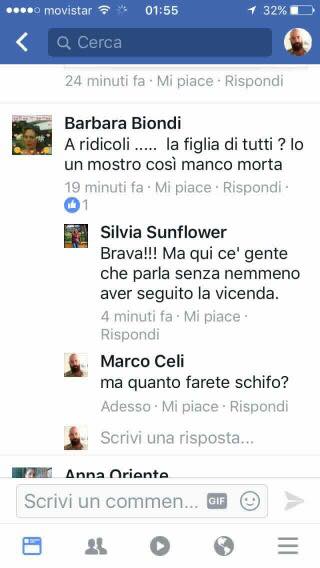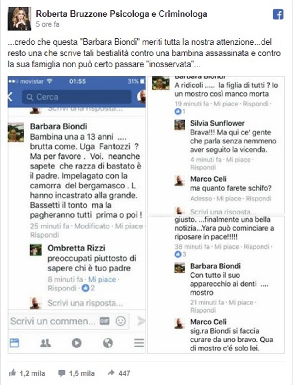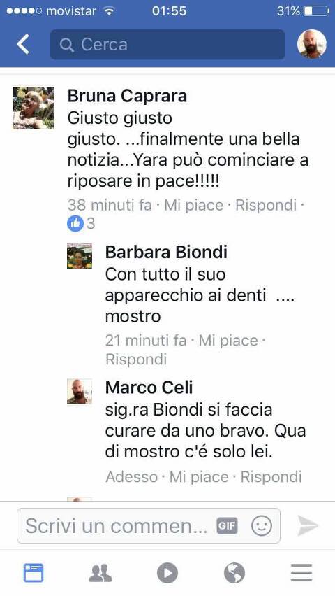 Sulla ragazzina di 13 anni, brutalmente uccisa nel 2011, l’utente Barbara Biondi esprime commenti senza pietà: “Una bambina brutta come Uga Fantozzi”, scrive. E ancora: “Un mostro con l’apparecchio”, riferendosi ai bottoncini che la povera Yara portava ai denti. Poi si scaglia anche contro il papà di Yara. “Voi non sapete neanche che razza di bastardo è il padre”.