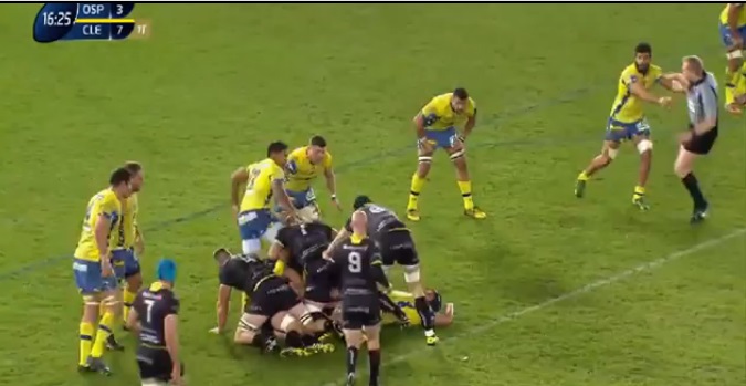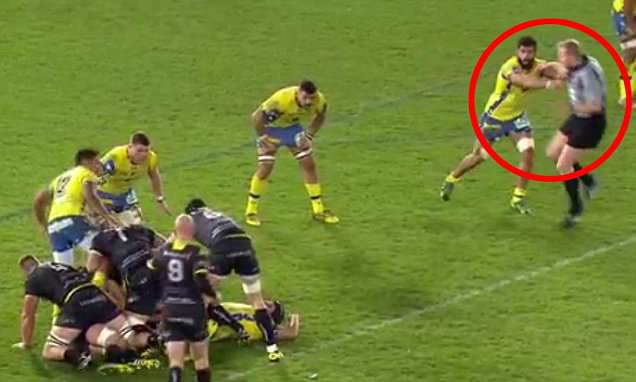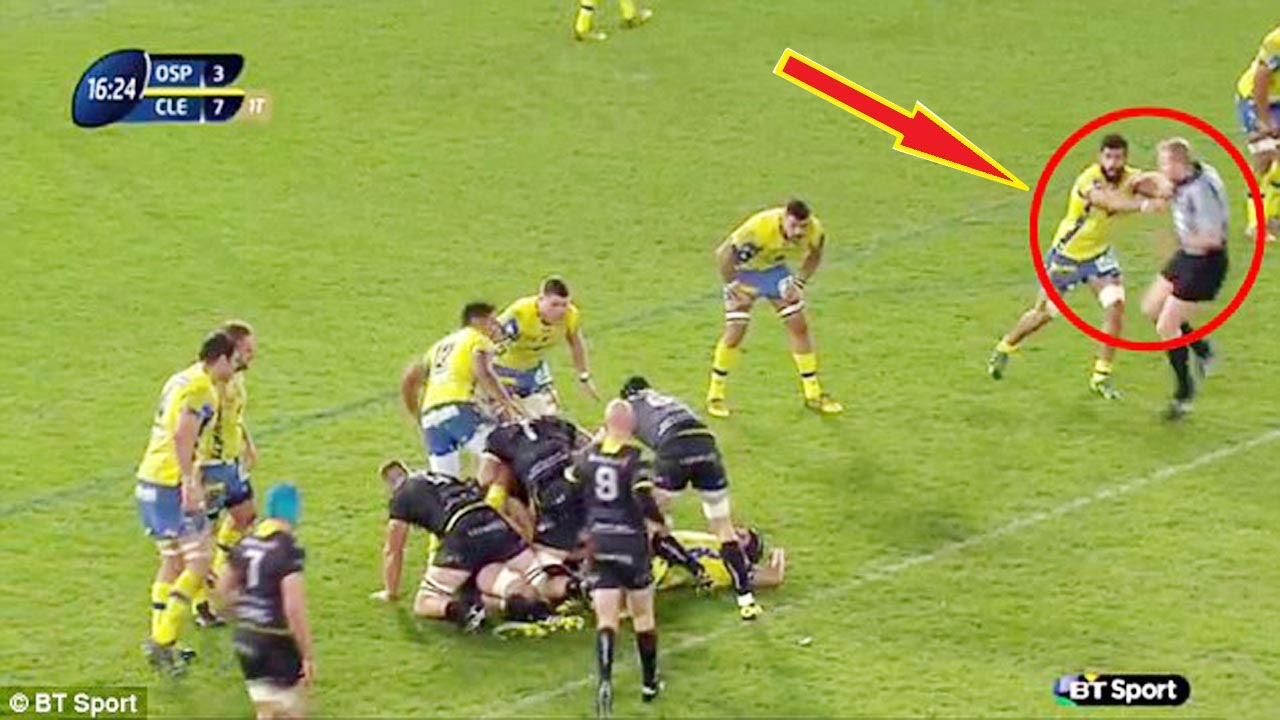 CLERMONT (FRANCIA) – In una partita di rugby European Champions Cup, durante la preparazione di una mischia il giocatore Viktor Kolelishvili del Clermont prende a spinte l’arbitro che gli era davanti ostruendo la visuale.