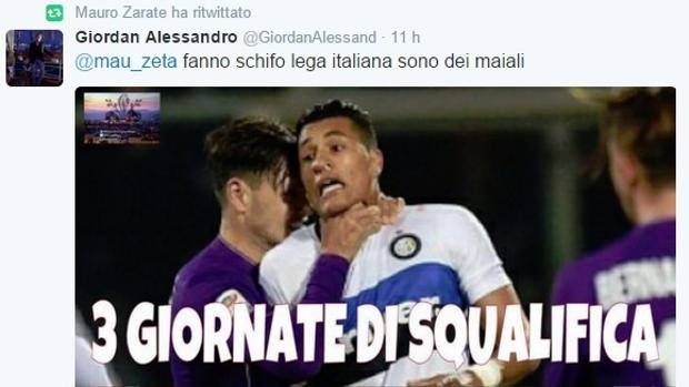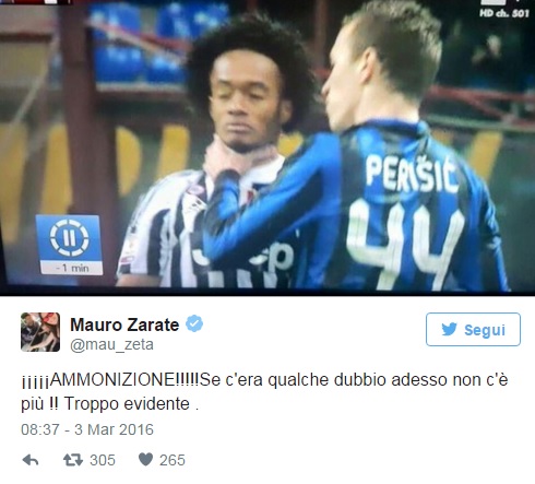 FIRENZE – Mauro Zarate dopo aver visto Perisic mettere le mani al collo di Cuadrado nella semifinale di Coppa Italia Inter-Juventus non ha resistito a dire la sua. “¡¡¡¡¡AMMONIZIONE!!!!! Se c’era qualche dubbio adesso non c’è più !! Troppo evidente” ha scritto su Twitter riferendosi ironicamente all’episodio simile (con Murillo in Fiorentina-Inter) che gli è costato il rosso in campo e 3 giornate di squalifica.